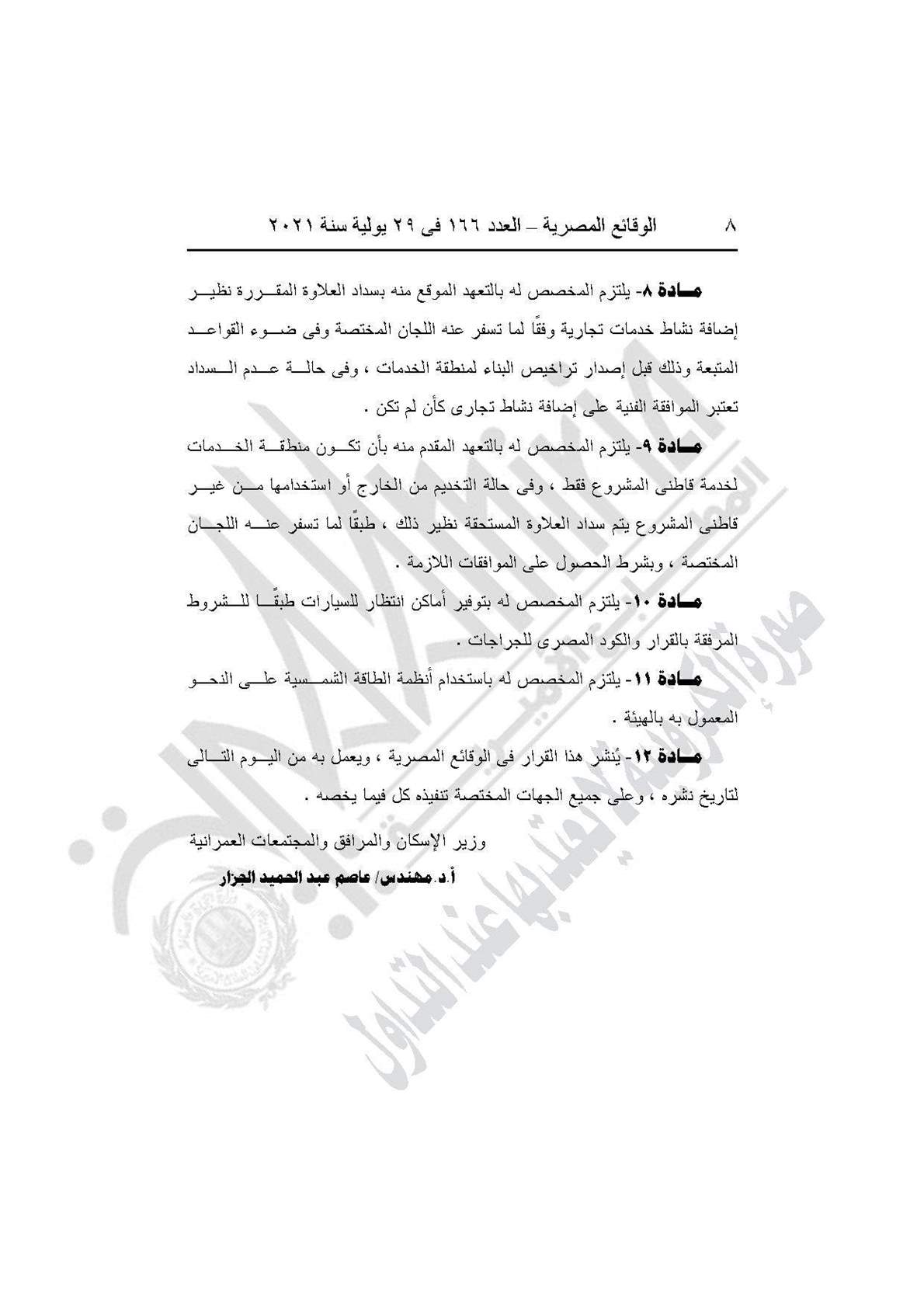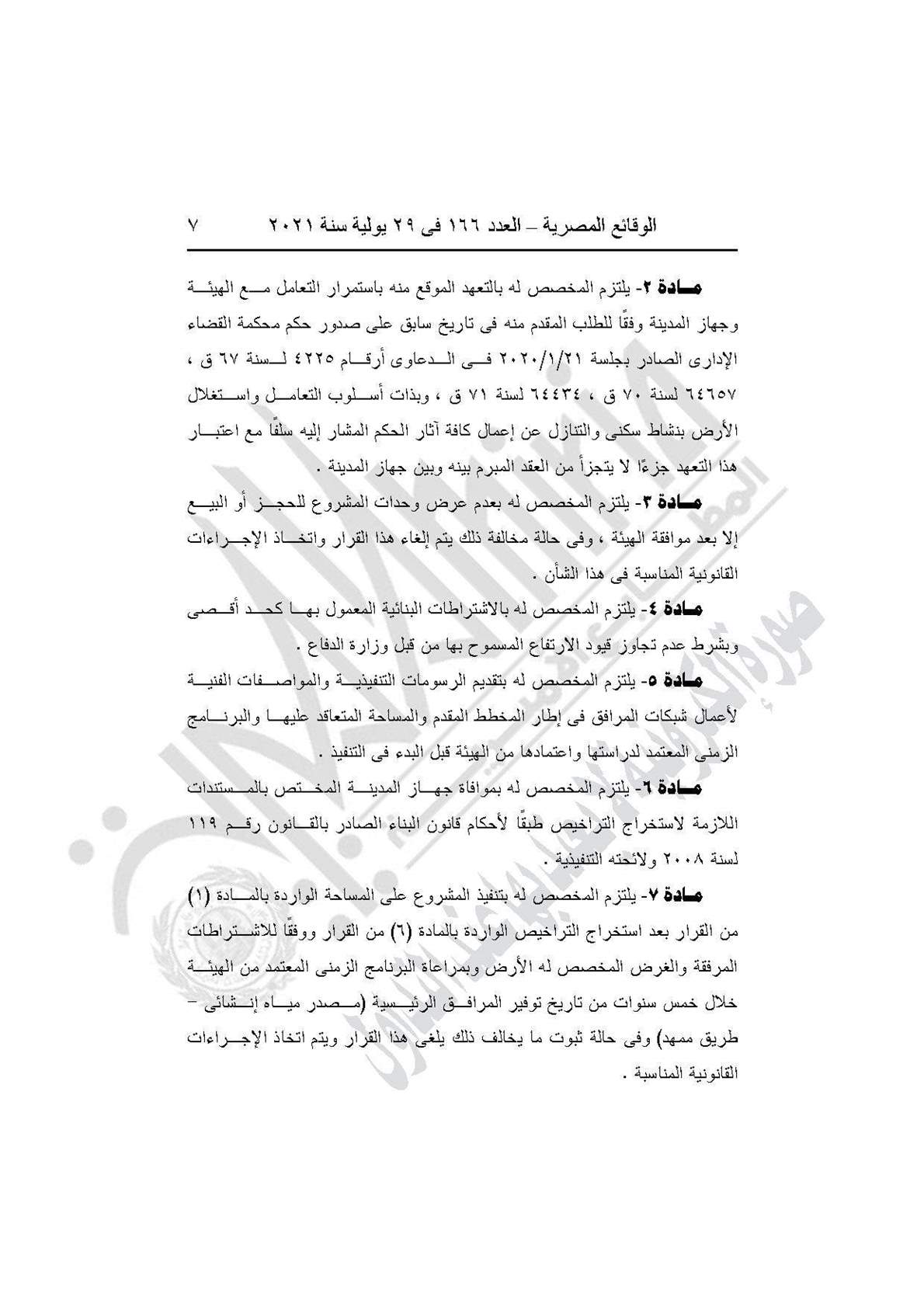 وجاء في المادة الثانية للقرار "يلتزم المخصص له بالتعهد الموقع من باستمرار التعامل مع الهيئة وجهاز المدينة وفقًا للطلب المقدم منه في تاريخ سابق على صدور حكم القضاء الإداري الصادر بجلسة 21/1/2020.