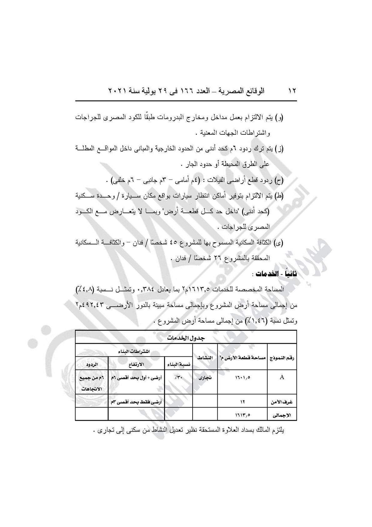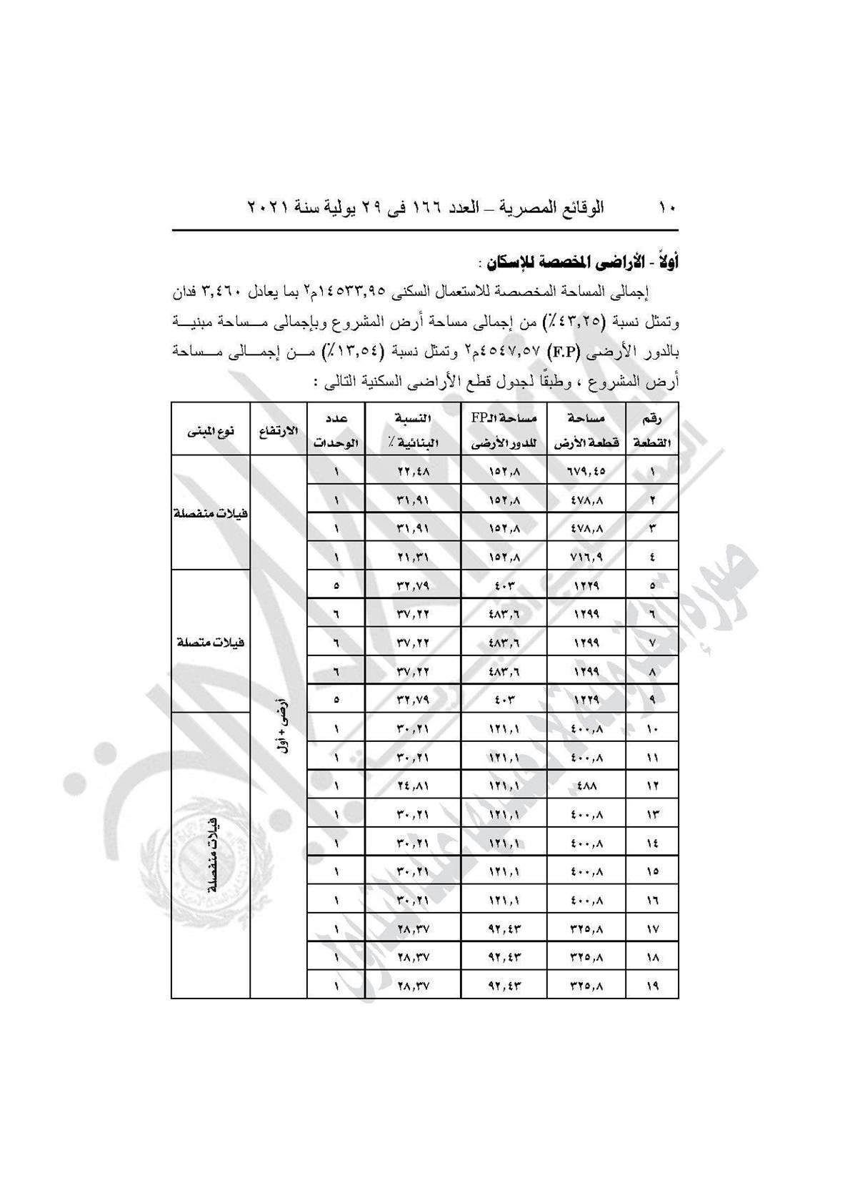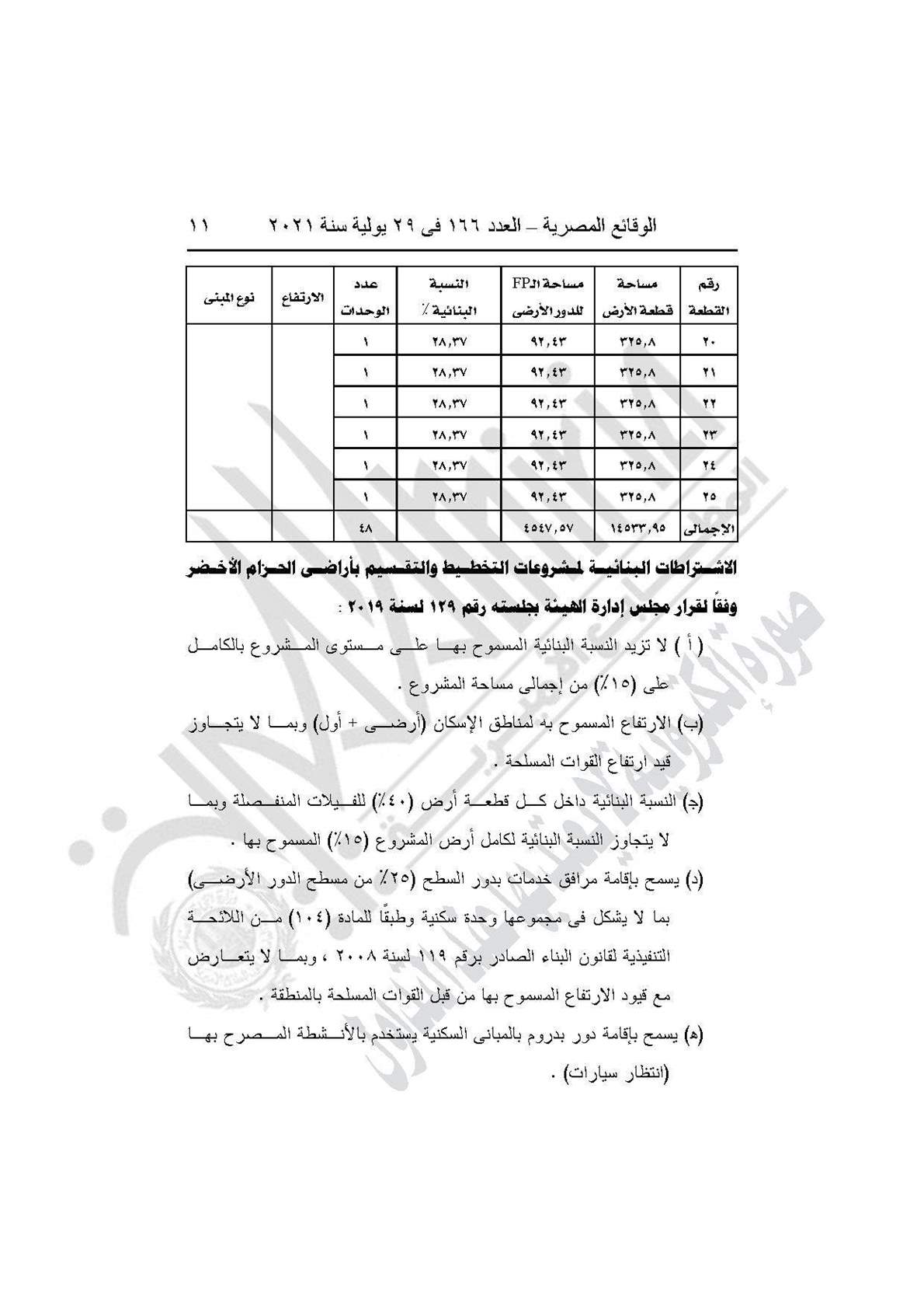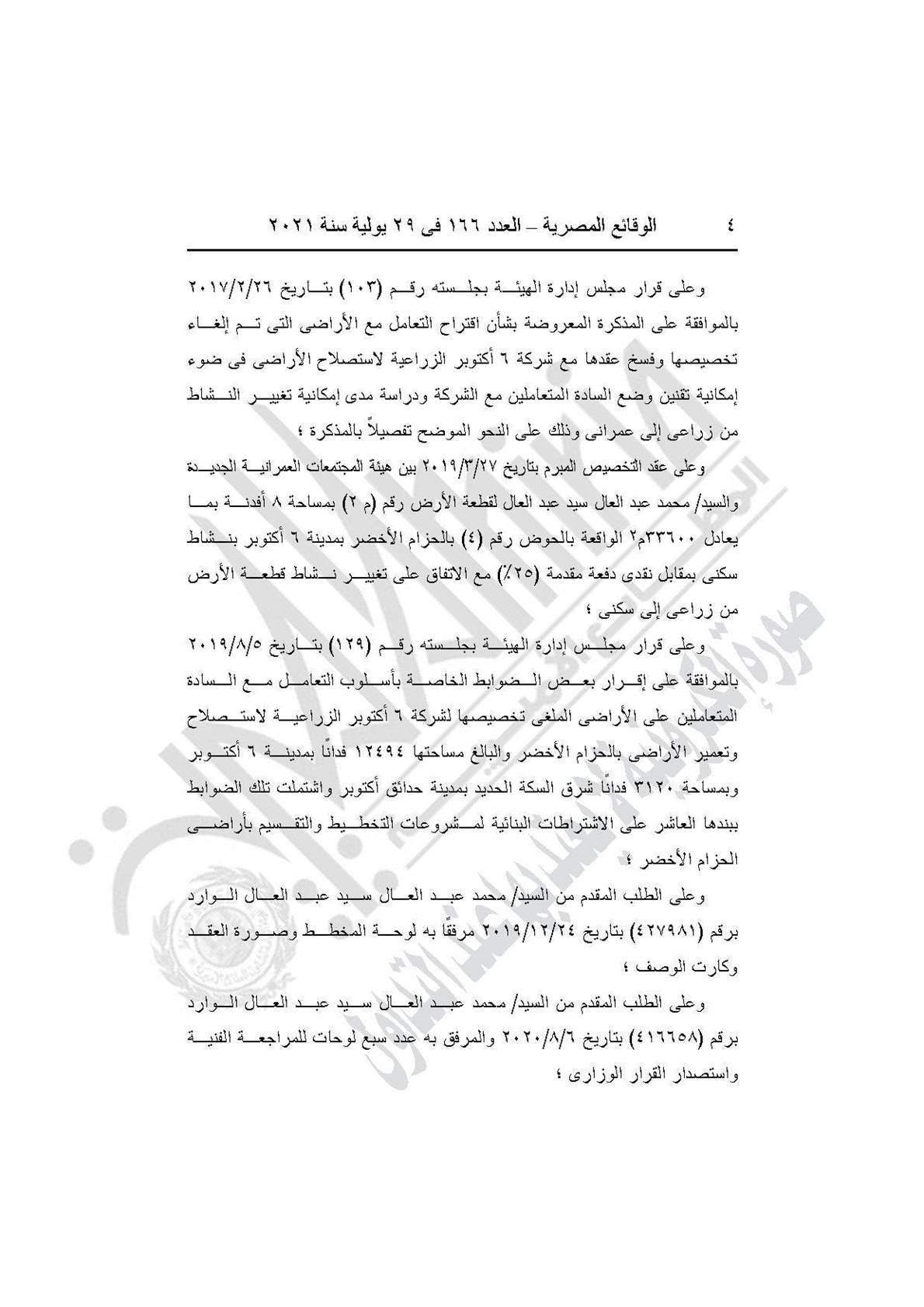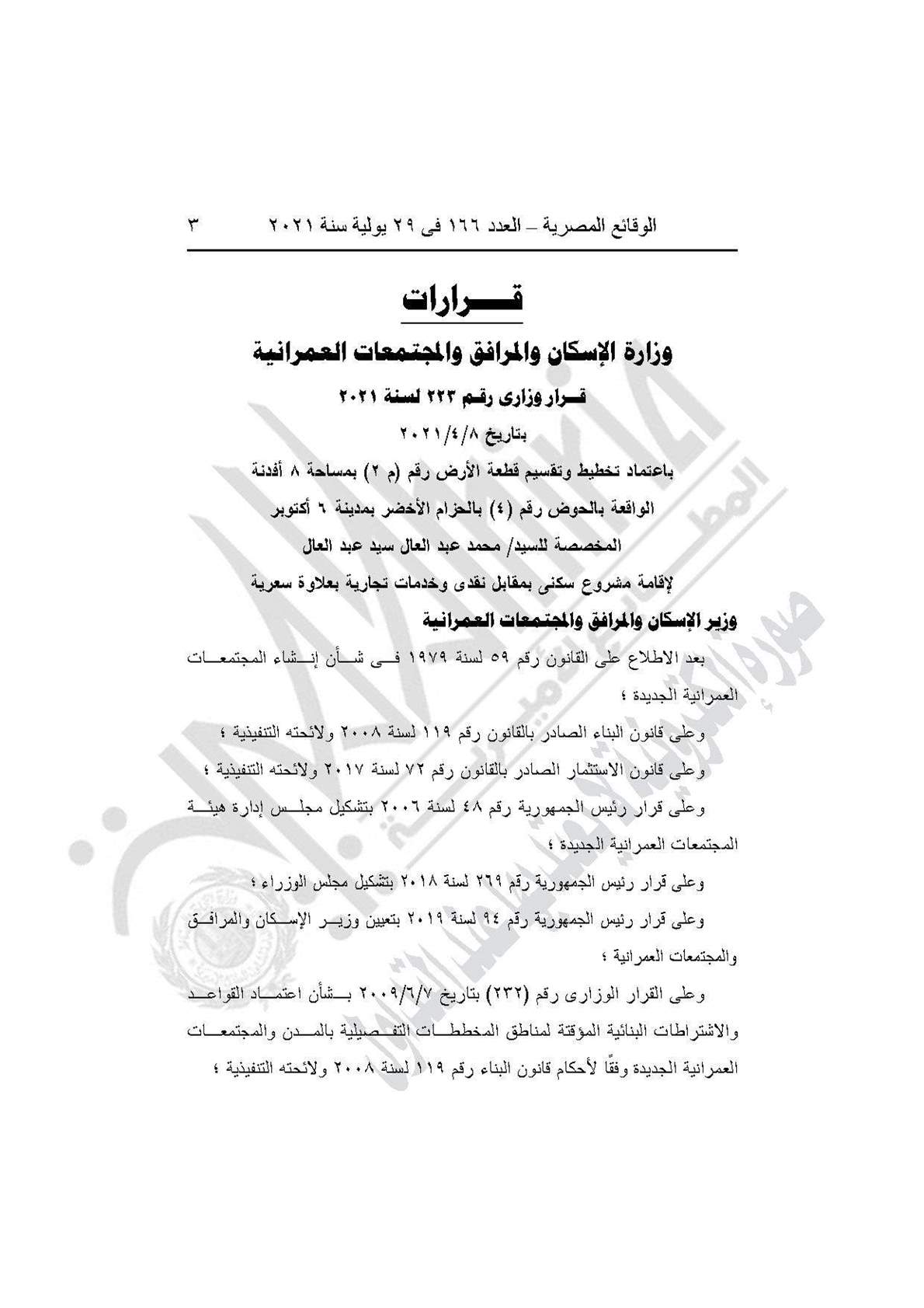 نشرت جريدة الوقائع المصرية في عددها رقم 166، الصادر في 29 يوليو 2021، قرار وزارة الإسكان والمرافق والمجتمعات العمرانية رقم 223 لسنة 2021، باعتماد تخطيط وتقسيم قطعة الأرض رقم (م 2) بمساحة 8 أفدنة الواقعة بالحوض رقم (4) بالحزام الأخضر بمدينة 6 أكتوبر، لإقامة مشروع سكني بمقابل نقدي وخدمات تجارية بعلاوة سعرية.