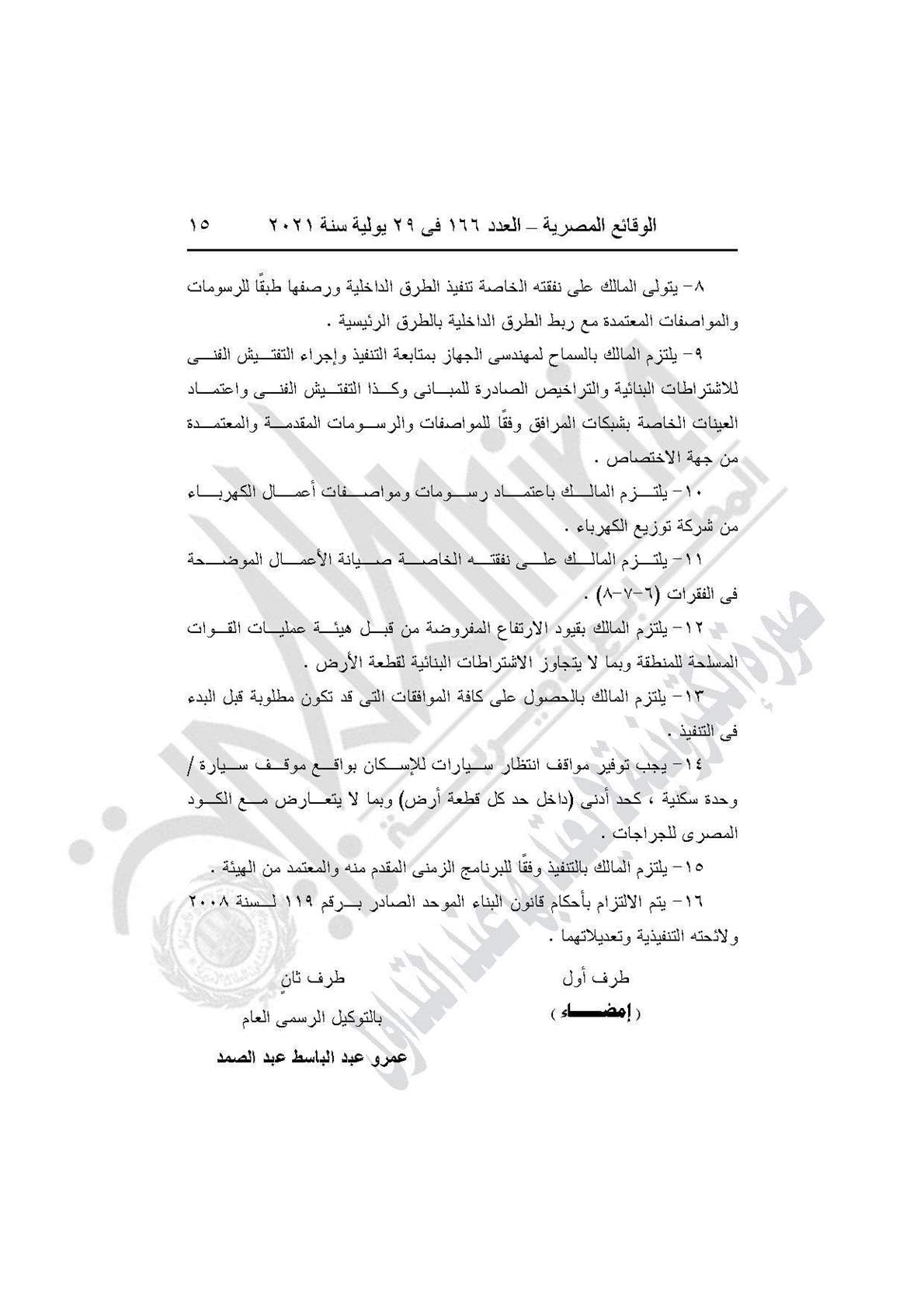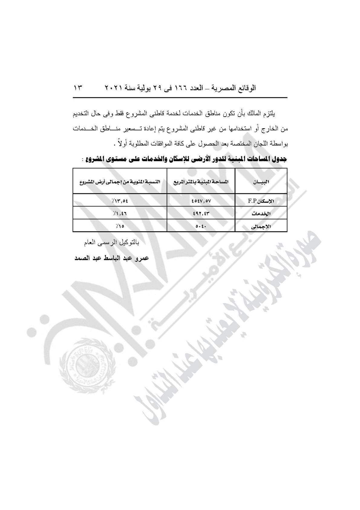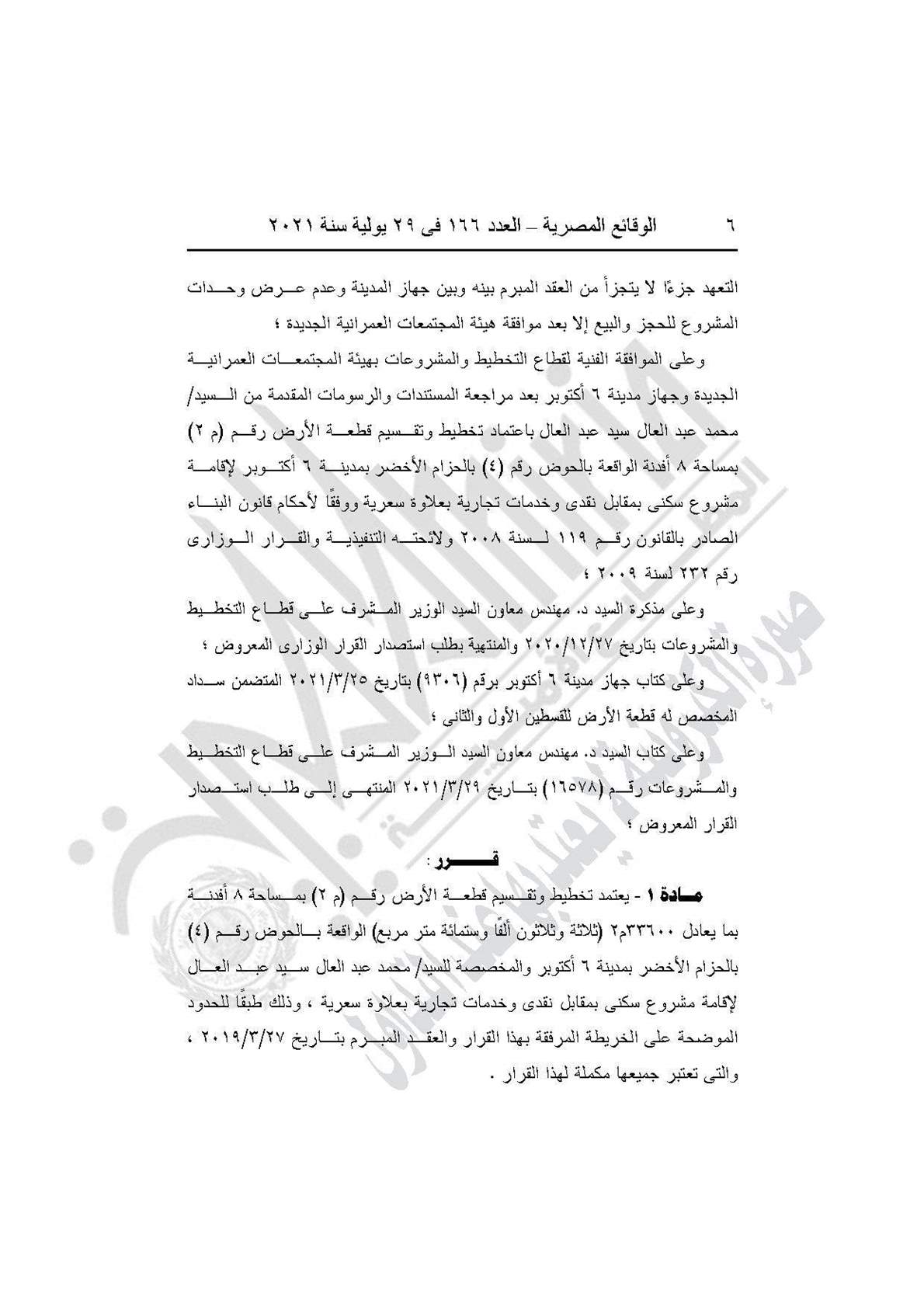 ونص القرار في مادته الأولى على اعتماد تخطيط وتقسيم قطعة الأرض رقم (م 2) بمساحة 8 أفدنة، بما يعادل 33600 متر مربع، الواقعة بالحوض رقم (4) بالحزام الأخضر بمدينة 6 أكتوبر المخصصة لـ محمد عبد العال سيد عبد العال، لإقامة مشروع سكني بمقابل نقدي وخدمات تجارية بعلاوة سعرية، طبقًا للحدود الموضحة على الخريطة، والعقد المبرم.