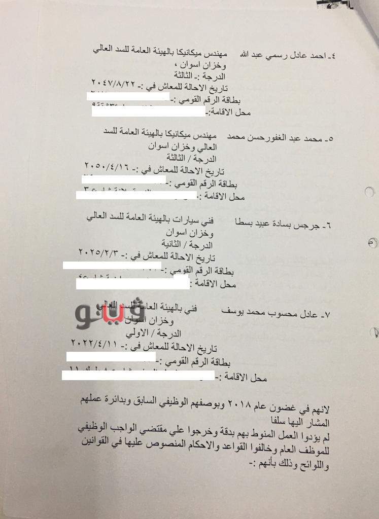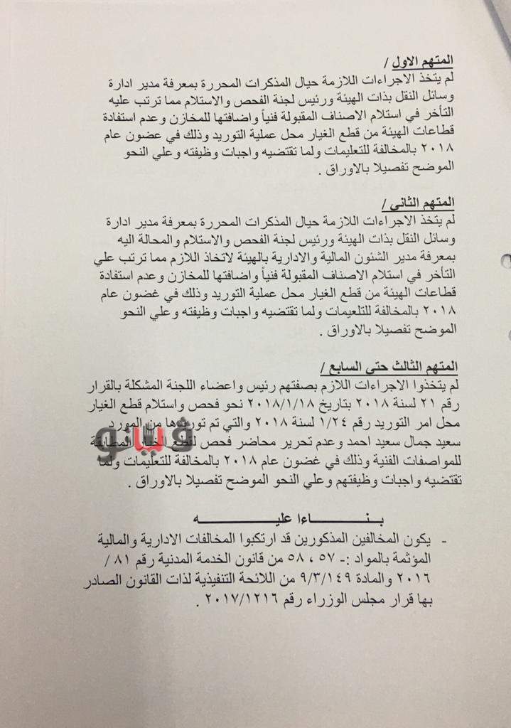 وكشفت التحقيقات أن محمد عبد الرحمن علي، رئيس الإدارة المركزية للشئون المالية والإدارية بالهيئة العامة للسد العالي وخزان أسوان وأحمد عبد الله سليم، مدير إدارة العقود والمشتريات بالهيئة لم يتخذا الإجراءات اللازمة حيال المذكرات التي حررها مدير إدارة وسائل النقل بذات الهيئة ورئيس لجنة الفحص والاستلام والمحالة إليها بمعرفة مدير الشؤون المالية والإدارية، مما ترتب عليه التأخر في تسلم الأصناف المقبولة فنيًا وإضافتها للمخازن وعدم استفادة قطاعات الهيئة من قطع الغيار محل عملية التوريد بالمخالفة للتعليمات وما تقتضيه واجبات وظيفتهما.