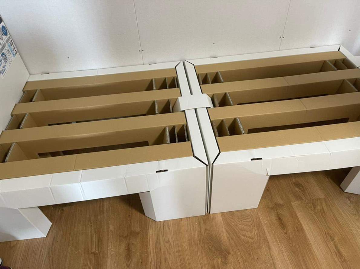 السرير رغم أنه مصنوع من الكرتون إلا أنه قوي ويتحمل، مع إمكانية التخلص منه بسهوله بعد دورة أولمبياد طوكيو.