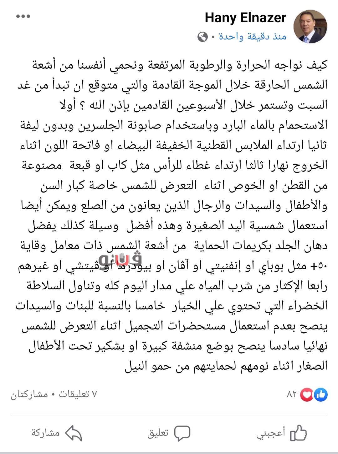 وقدم الدكتور هانى الناظر استشارى الأمراض الجلدية، عدة نصائح لمتابعيه عبر صفحته الرسمية بموقع التواصل الإجتماعى "فيس بوك"، وجاء بها: كيف نواجه الحرارة والرطوبة المرتفعة ونحمي أنفسنا من أشعة الشمس الحارقة خلال الموجة القادمة والتي متوقع ان تبدأ من غد السبت وتستمر خلال الأسبوعين القادمين بإذن الله، وهناك عدة نصائح يجب اتباعها، منها:-