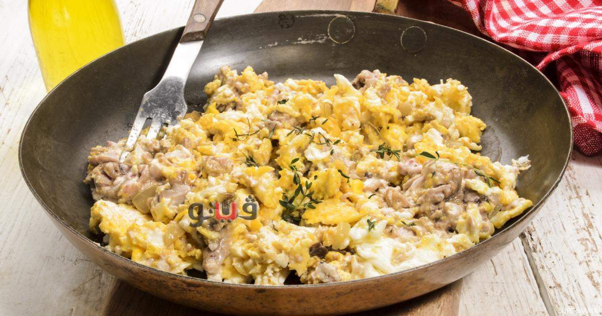 أضيفي البيض وقلبيه مع المخ حتى ينضج البيض تماماً .