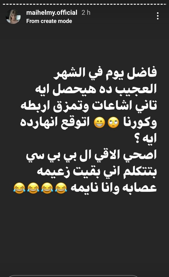 ونشرت مي حلمي فيديو عبر خاصيه الاستوري قائلة: "مش شامة حاجة بالغلط ولا حتى فلفل.. فاضل يوم في الشهر العجيب دا هيحصل ايه تاني اشاعات وتمزق اربطة وكورونا..اتوقع انهارده ايه اصحى الاقي البي بي سي بتتكلم اني بقيت زعيمة عصابة وأنا نايمة".