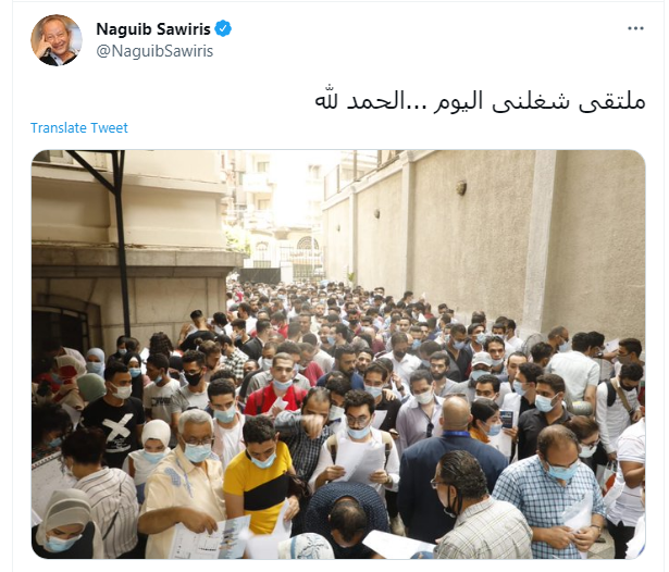 وكان مهندس نجيب ساويرس أعلن، عبر حسابه على تويتر، عن موعد ملتقى شغلني السادس للتوظيف، والذي يقدم 7000 فرصة عمل بالتعاون مع كبرى الشركات في السوق المصري وفي مختلف التخصصات، بحسب تغريدة لساويرس على تويتر.