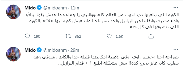 وكتب أحمد حسام ميدو تغريدة على تويتر "بصراحة إحنا وحشين اوي وفي لعيبة إمكانيتها قليلة جدا والكابتن شوقي وهو مغلوب كان عايز يخرج كده!! مش مشكله اطلع ١-٠ قدام البرازيل..".
