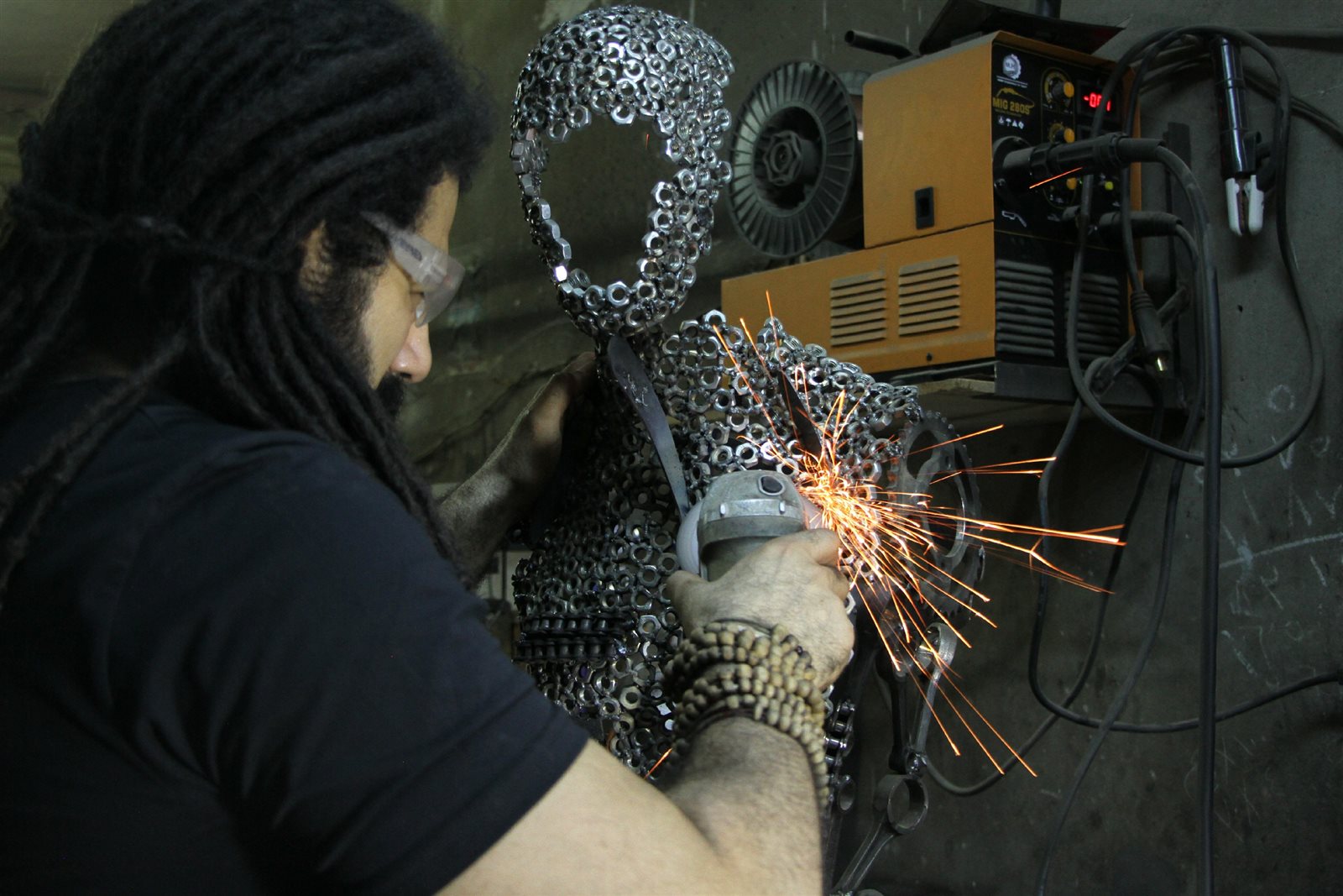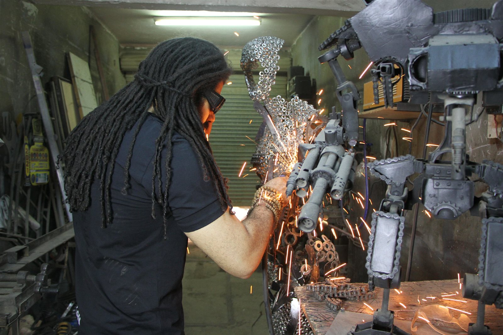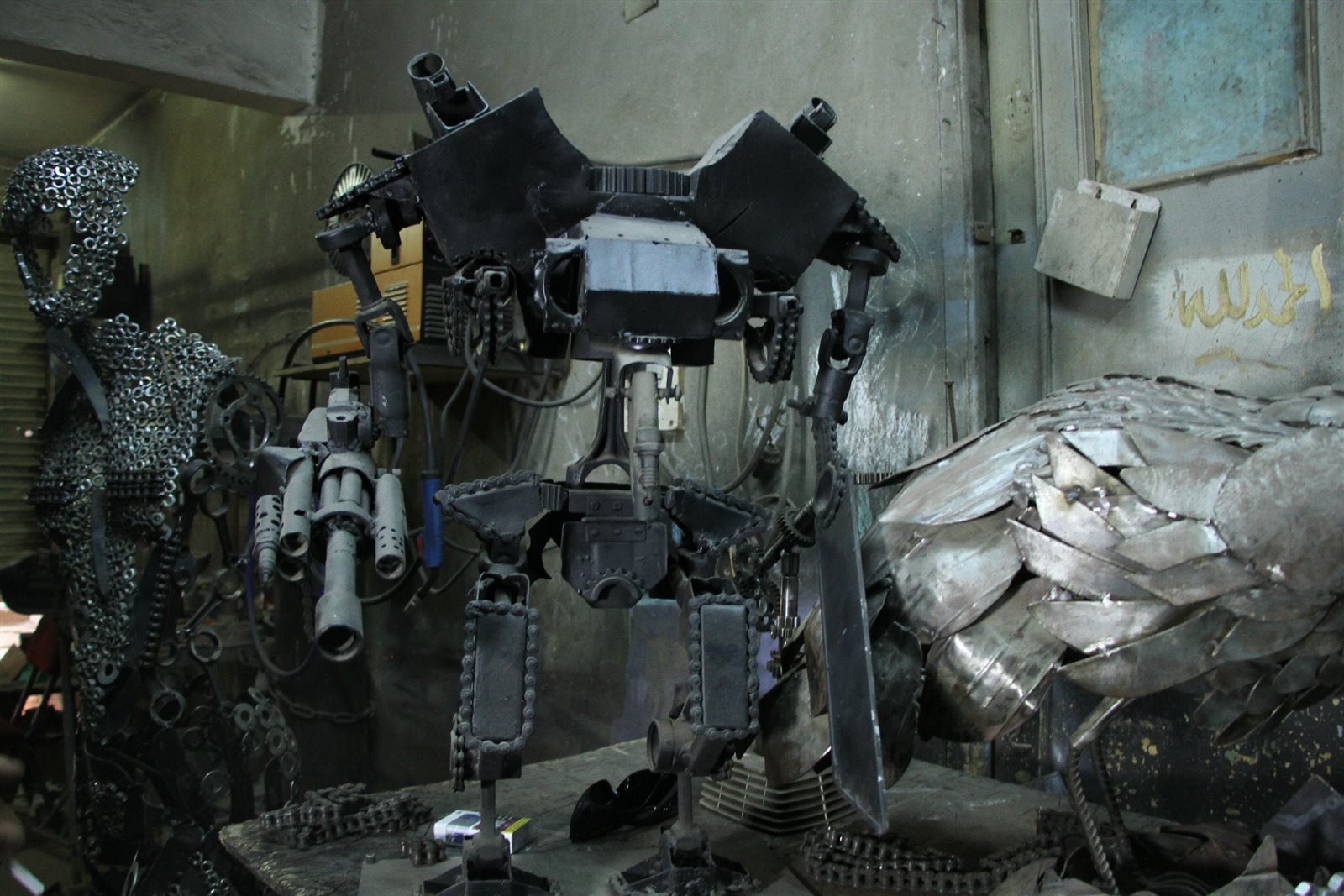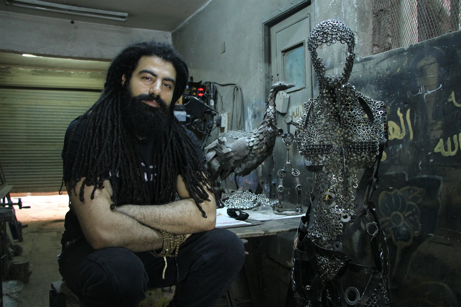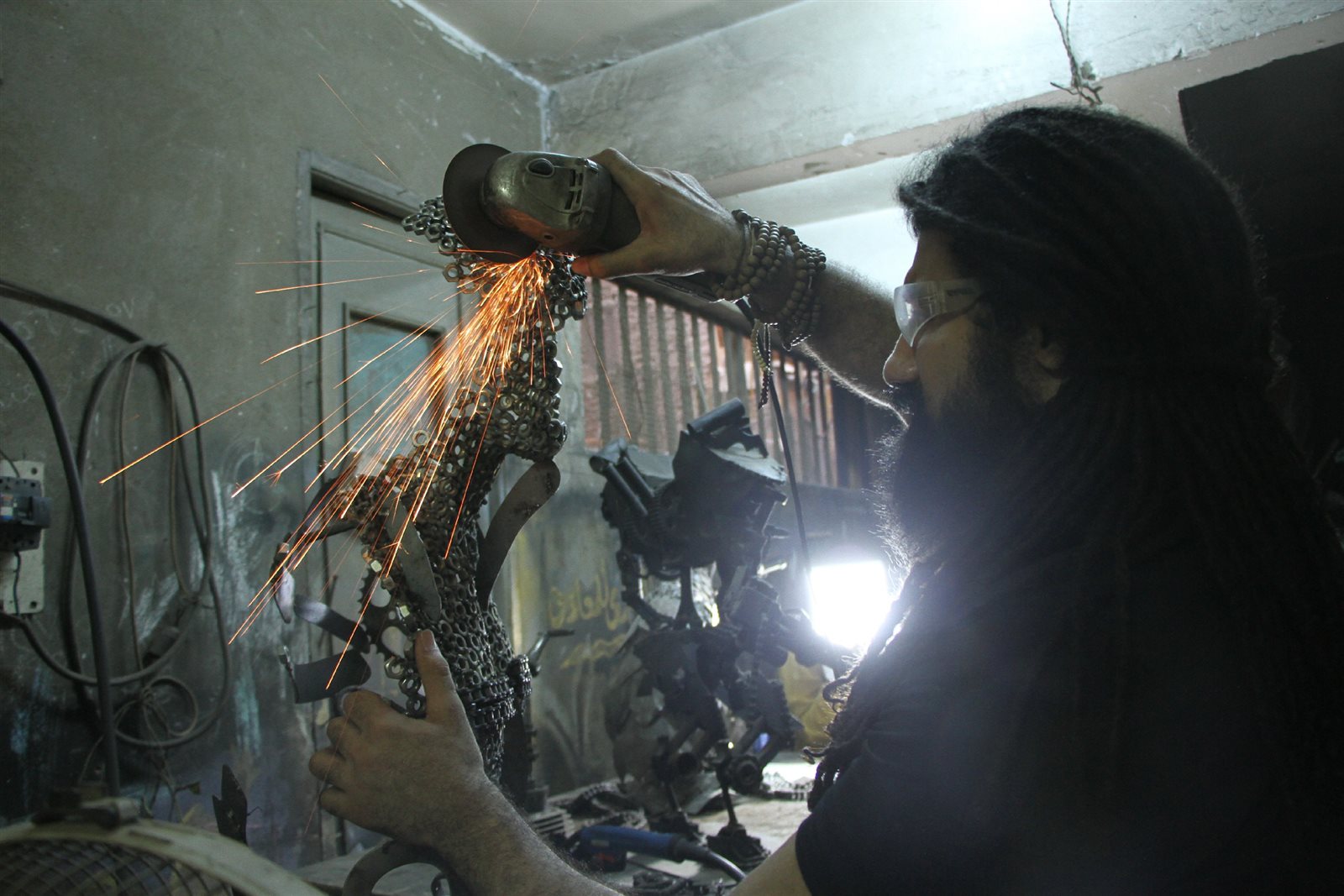 داخل إحدى ورش الحِدادة في منطقة عين شمس بالقاهرة، يتناهى إلى سمعك وأنت تمر من الشارع صوت آلات من تلك التي تستخدم في لحام الحديد أو قطعه، للوهلة الأولى، تظن أن أحدهم يصنع بوابة أو شباكًا حديديًّا أو ما شابه، ولكن الحقيقة غير ذلك، فداخل الورشة يقف الثلاثيني فنان الخردة عبد الرحمن عوف ممسكًا بأدوات قطع ولحام الحديد ليصنع من «الخردة» مجسمات وتماثيل!
