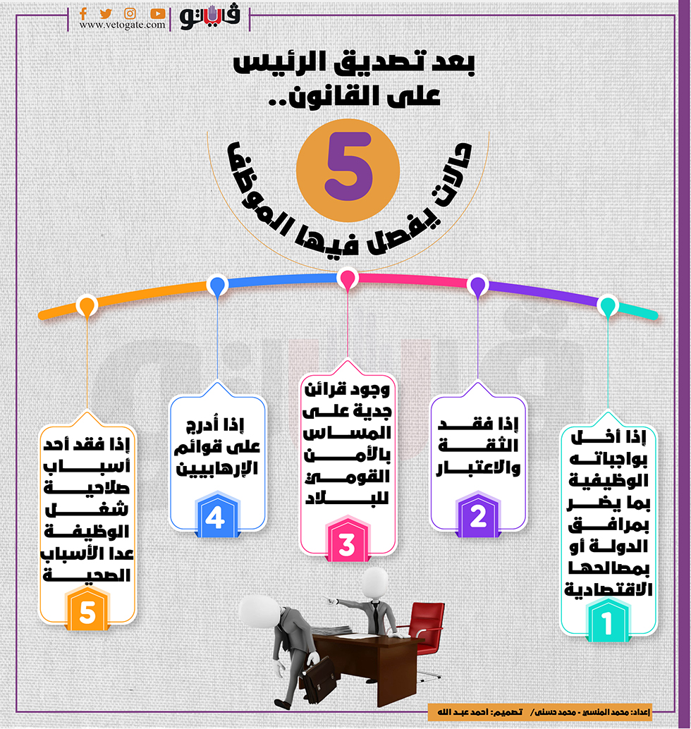 بعد تصديق الرئيس على القانون.. 5 حالات يفصل فيها الموظف| إنفوجراف الإثنين 02/أغسطس/2021 - 12:51 م 8/2/2021 12:51:39 PM مجلس النواب محمد المنسي - محمد حسني شارك طباعة 18 حجم الخط شارك طباعة الإرهاب الرئيس الإرهابيين قوائم الارهاب الموظف الأمن القومي الاقتصاد الثقة