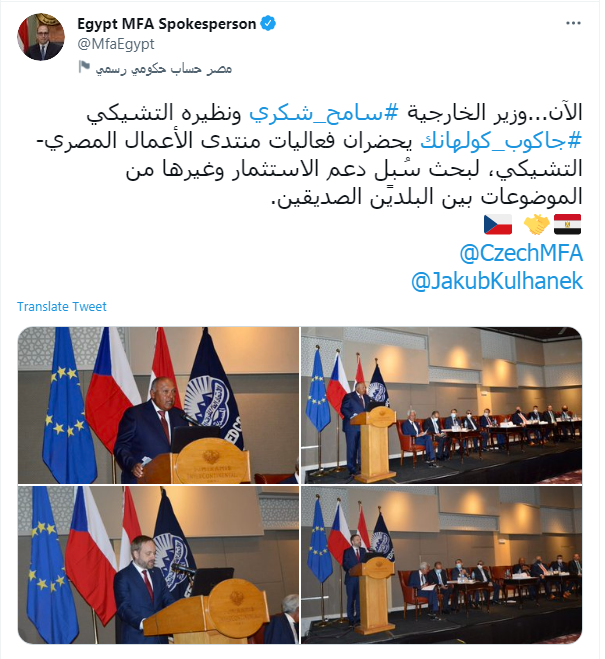 وكتب المستشار أحمد حافظ تغريدة على تويتر "الآن...وزير الخارجية #سامح_شكري ونظيره التشيكي #جاكوب_كولهانك يحضران فعاليات منتدى الأعمال المصري- التشيكي، لبحث سُبل دعم الاستثمار وغيرها من الموضوعات بين البلديًن الصديقين."