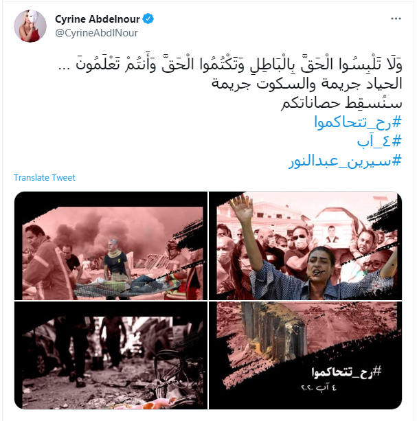 وكتبت سيرين عبد النور تغريدة على تويتر "وَلَا تَلْبِسُوا الْحَقَّ بِالْبَاطِلِ وَتَكْتُمُوا الْحَقَّ وَأَنتُمْ تَعْلَمُونَ… الحياد جريمة والسكوت جريمة.. سنُسقِط حصاناتكم #رح_تتحاكموا #٤_آب #سيرين_عبدالنور".