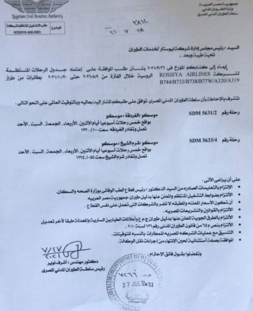 وأشارت سلطة الطيران المدني إلى أنه تم السماح لشركة الخطوط الروسية بالهبوط لمطار الغردقة بمعدل 5 رحلات أيام الإثنين والأربعاء والجمعة والسبت والأحد، كما تم السماح للشركة الروسية بالهبوط أيضا بـ 5 رحلات لمطار شرم الشيخ أيام الإثنين والأربعاء والجمعة والسبت والأحد أيضا.