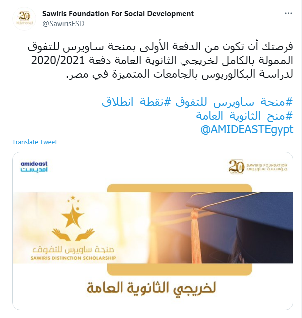 وكتبت مؤسسة ساويرس للتنمية الاجتماعية تغريدة على تويتر "فرصتك أن تكون من الدفعة الأولى بمنحة ساويرس للتفوق الممولة بالكامل لخريجي الثانوية العامة دفعة 2020 /2021 لدراسة البكالوريوس بالجامعات المتميزة في مصر. #منحة_ساويرس_للتفوق #نقطة_انطلاق #منح_الثانوية_العامة".
