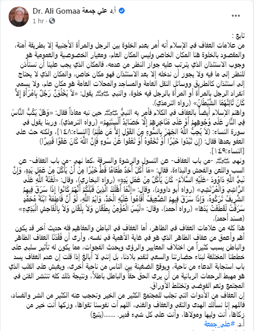وكتب علي جمعة تدوينة على صفحته بالفيس بوك "من علامات العفاف في الإسلام أنه أمر بعدم الخلوة بين الرجل والمرأة الأجنبية إلا بطريقة آمنة، والمقصود بالخلوة هنا المكان الخاص وليس المكان العام، ومعيار الخصوصية والعمومية هو وجوب الاستئذان الذي يترتب عليه جواز النظر من عدمه، فالمكان الذي يجب علينا أن نستأذن للنظر إلى ما فيه ولا يجوز أن ندخله إلا بعد الاستئذان فهو مكان خاص".