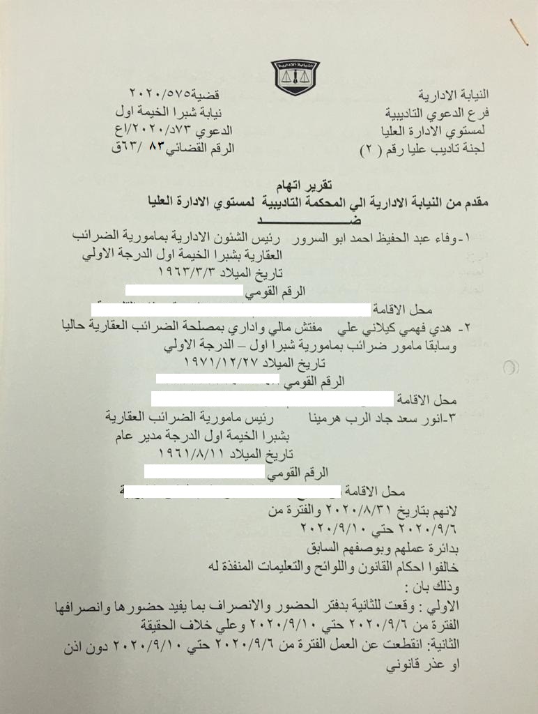 قررت النيابة الإدارية في القضية رقم 83 لسنة 63 قضائية عليا إحالة رئيس مأمورية الضرائب العقارية بشبرا الخيمة أول ومسئولين من مساعديه للمحاكمة التأديبية العاجلة بعد ثبوت ارتكابهم المخالفة الإدارية المؤثمة بالمواد 46 و57 و58 من قانون الخدمة المدنية رقم 81 لسنة 2016، ولائحته التنفيذية.