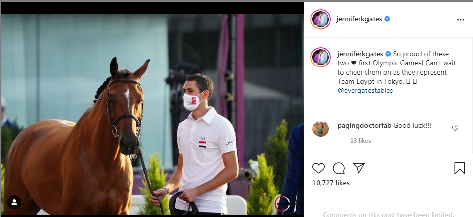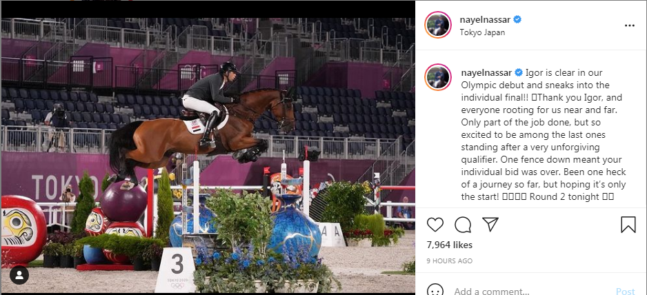 وفور فوز نصار كتبت جينفر جيتس، زوجة نايل نصار عبر إنستجرام، موجهة حديثها لنايل وجواده إيجور، قائلة: "فخورة جدًا بهذين الاثنين، أول ألعاب أولمبية، لم أستطع الانتظار لتحيتهم، أنهم يمثلان فريق مصر في طوكيو".