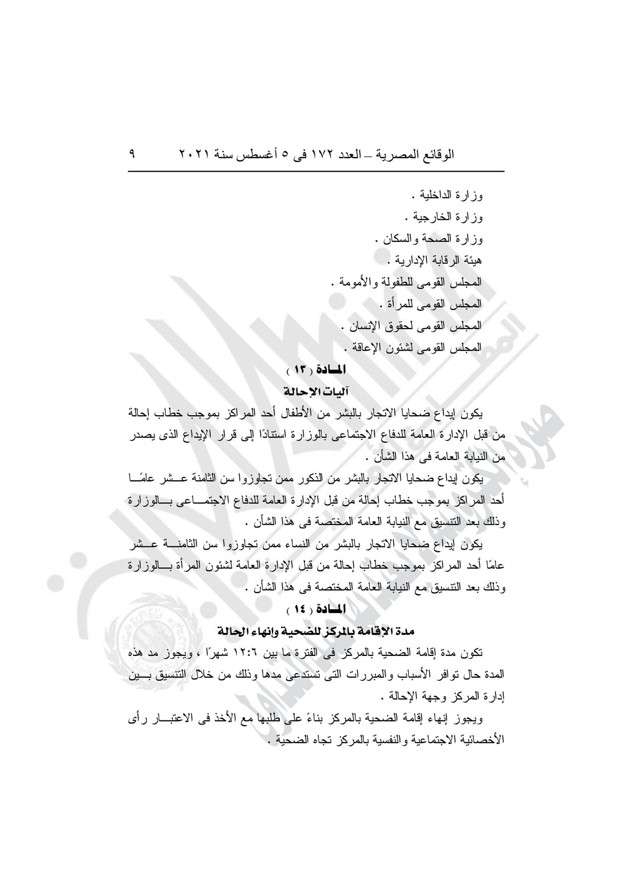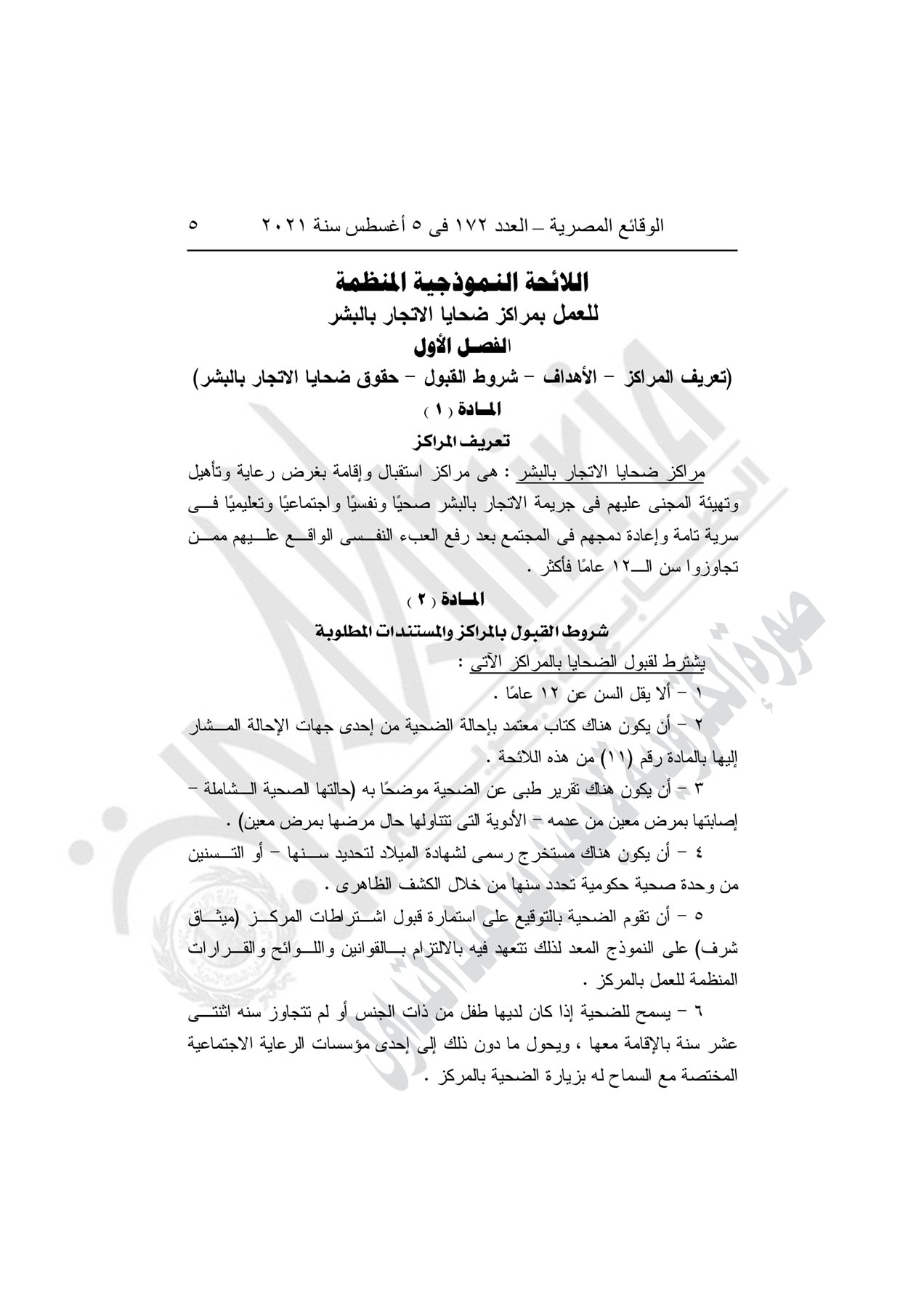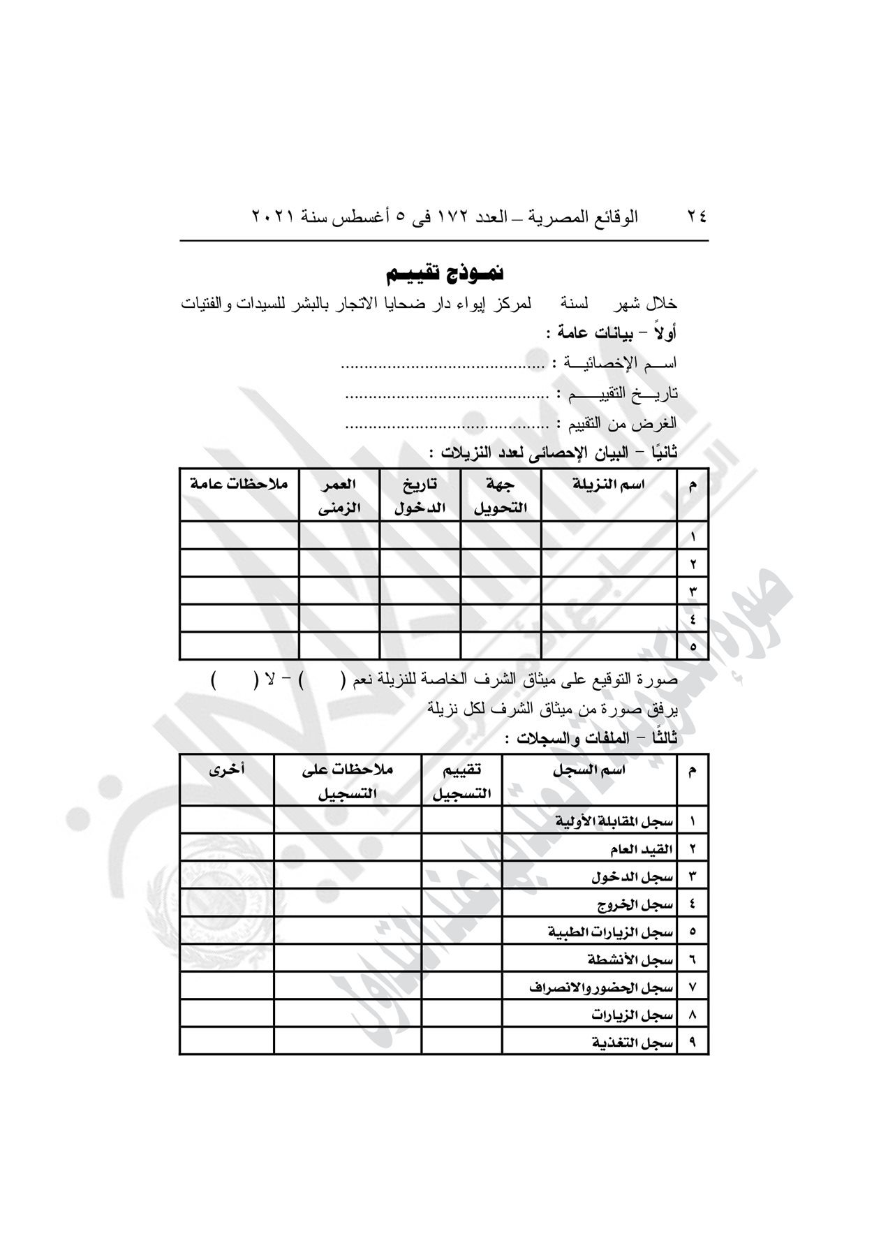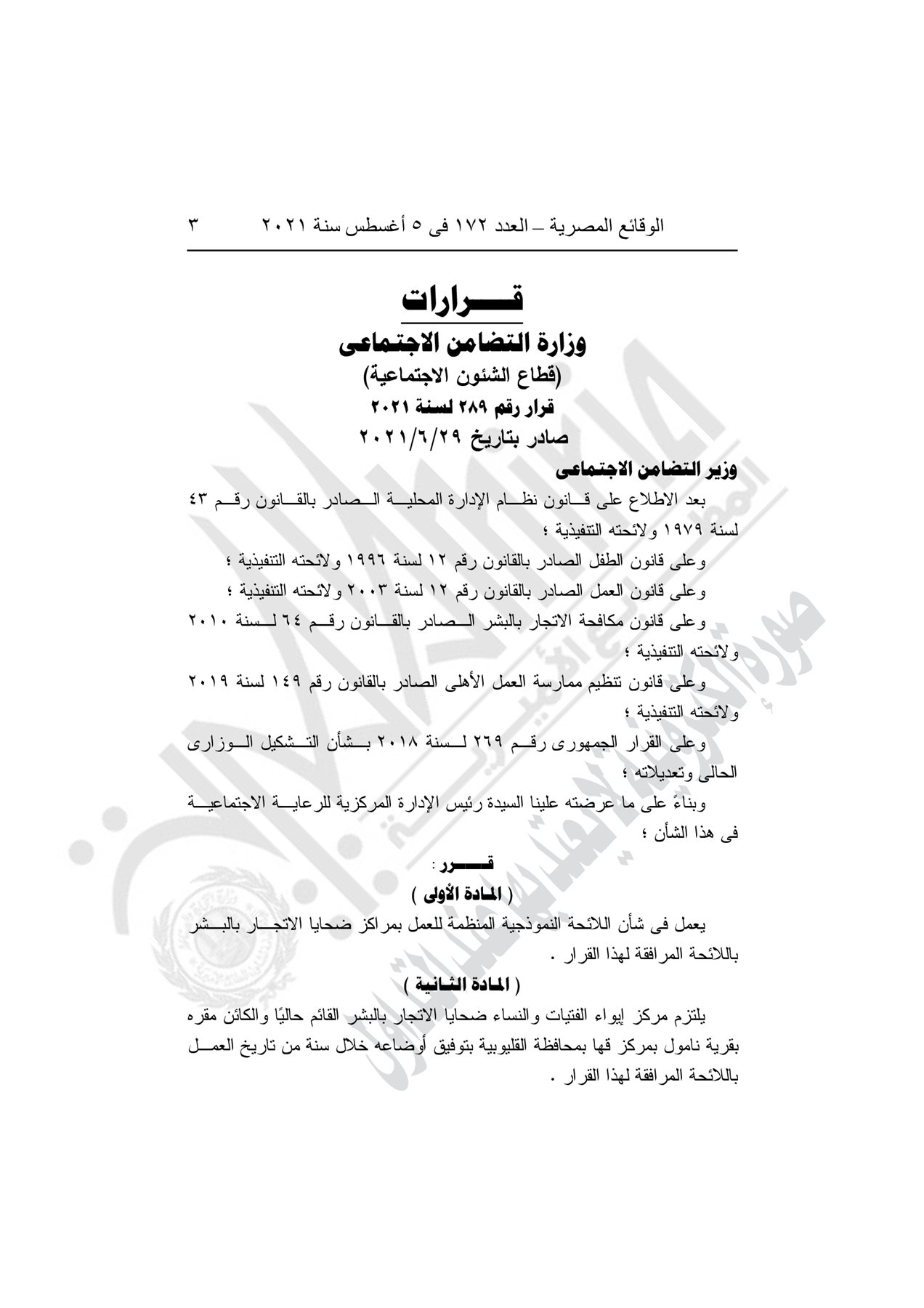 نشرت جريدة الوقائع المصرية في عددها رقم 172، الصادر في 5 أغسطس 2021، قرار وزارة التضامن الاجتماعي رقم 289 لسنة 2021، بشأن العمل باللائحة النموذجية المنظمة للعمل بمراكز ضحايا الإتجار بالبشر.
