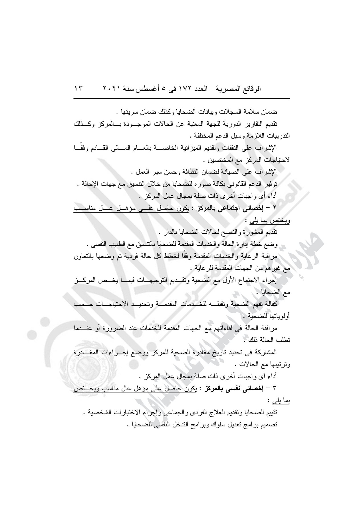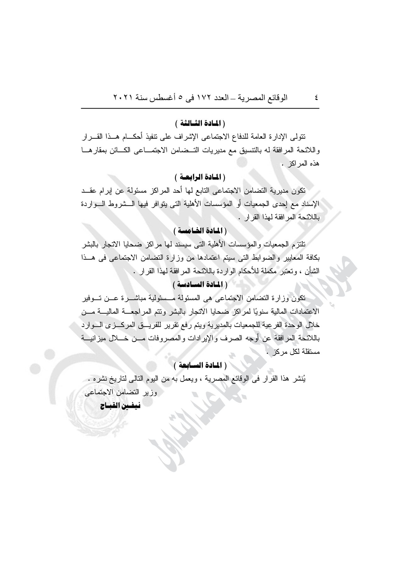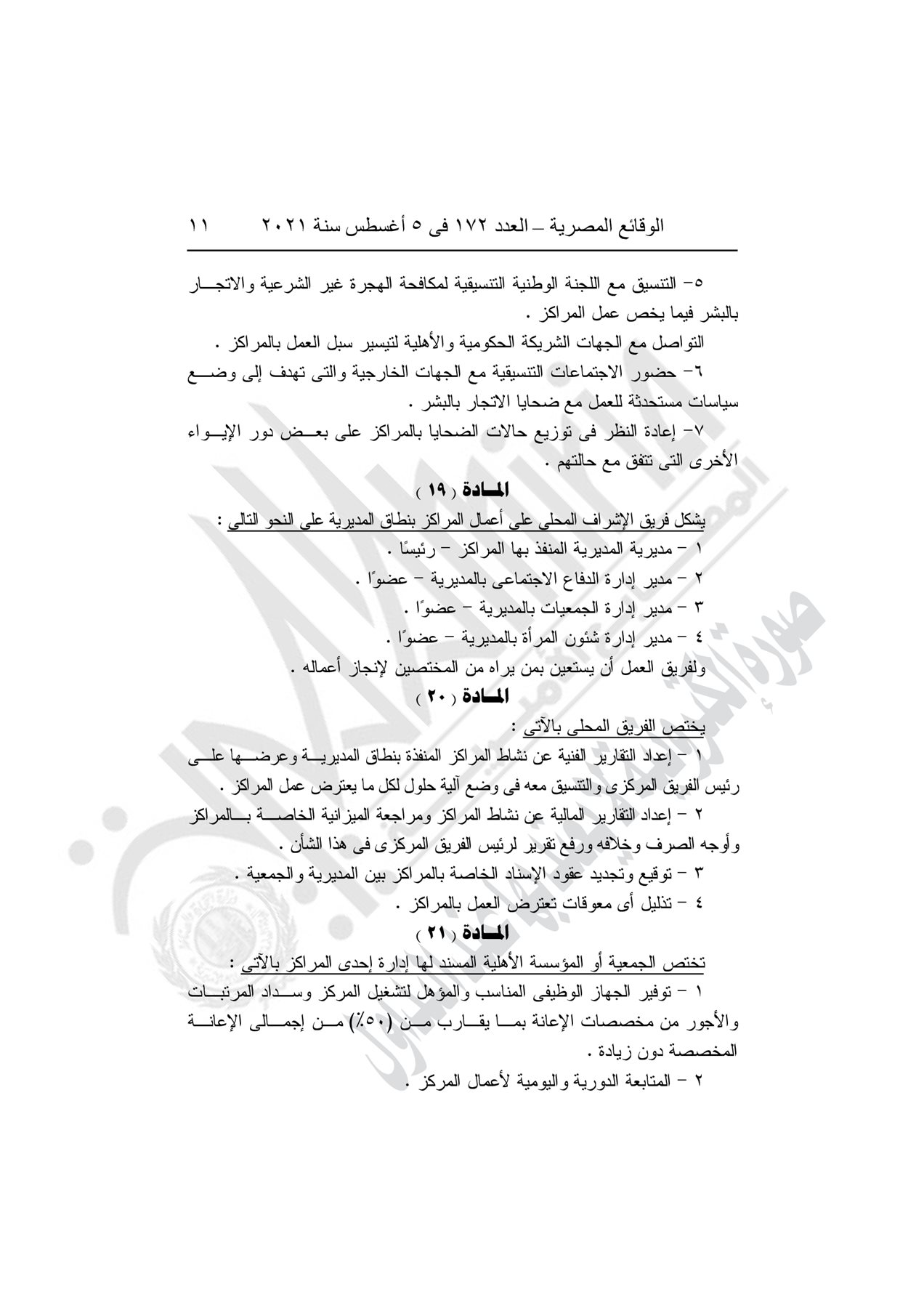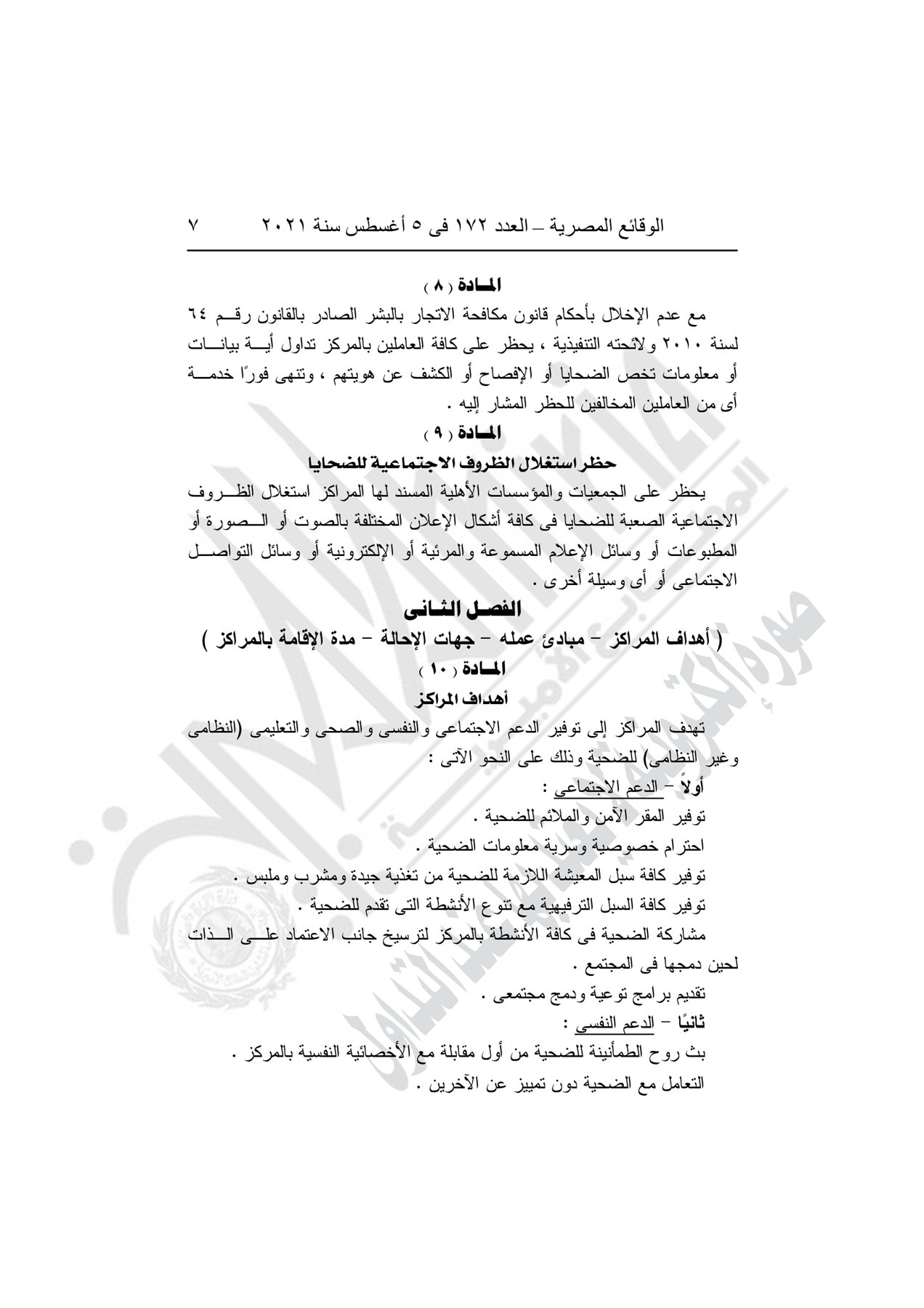 نشرت جريدة الوقائع المصرية في عددها رقم 172، الصادر في 5 أغسطس 2021، قرار وزارة التضامن الاجتماعي رقم 289 لسنة 2021، بشأن العمل باللائحة النموذجية المنظمة للعمل بمراكز ضحايا الإتجار بالبشر.