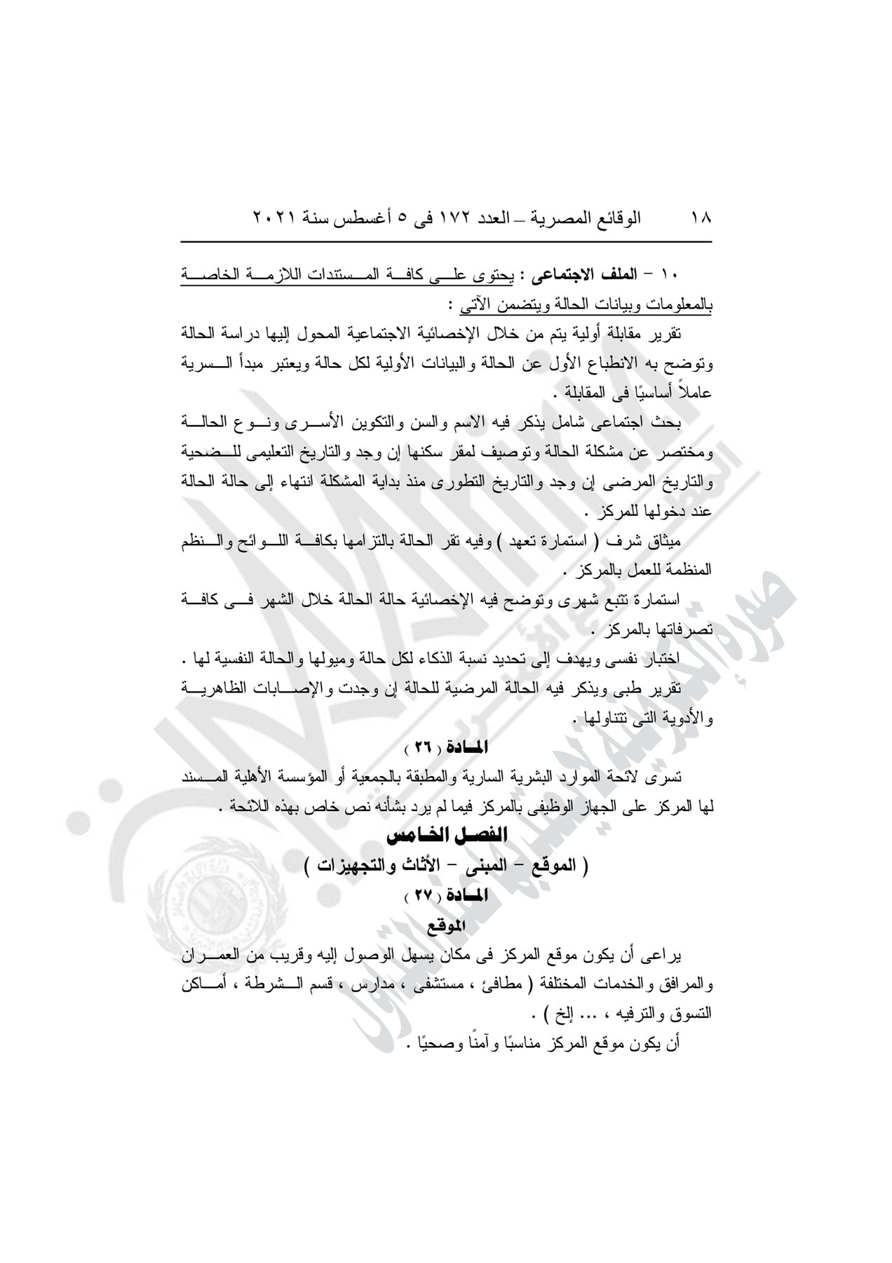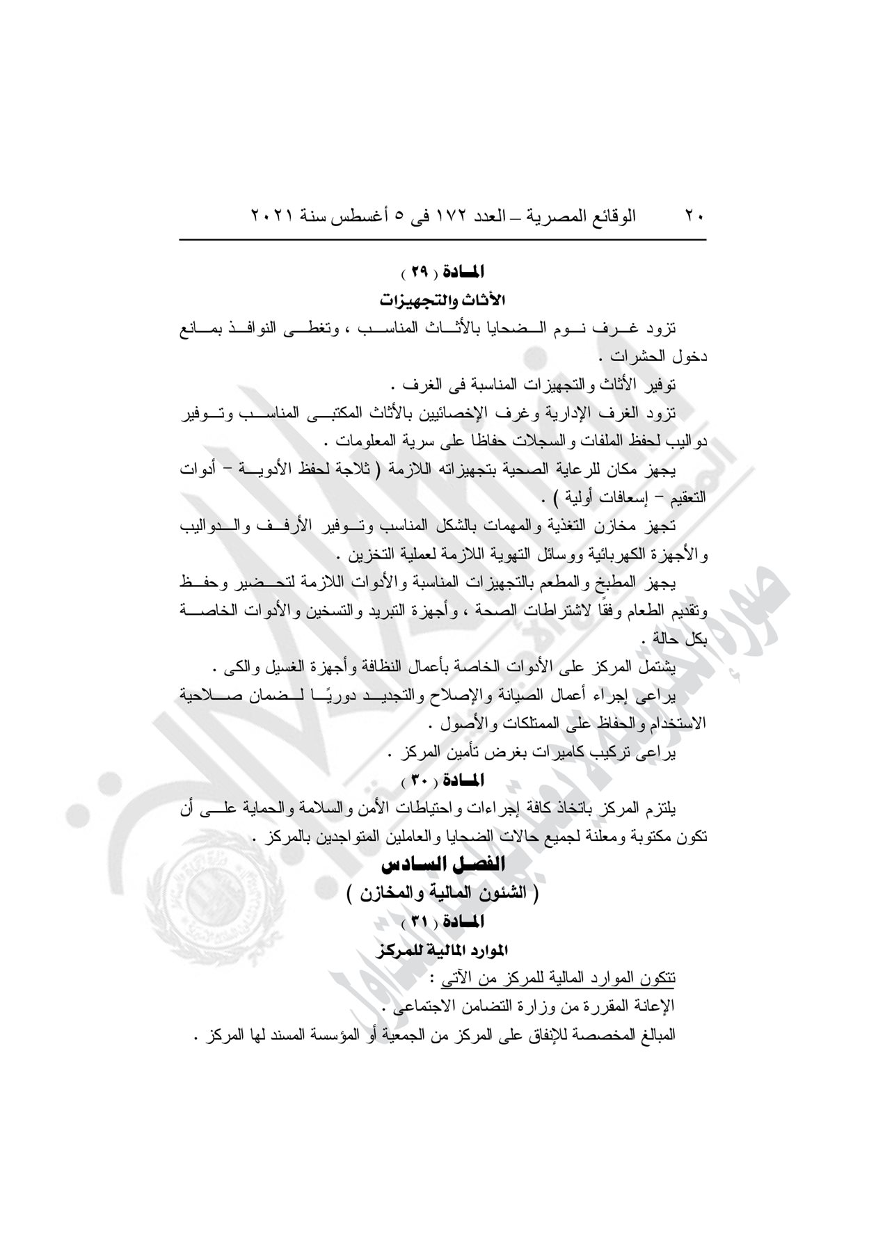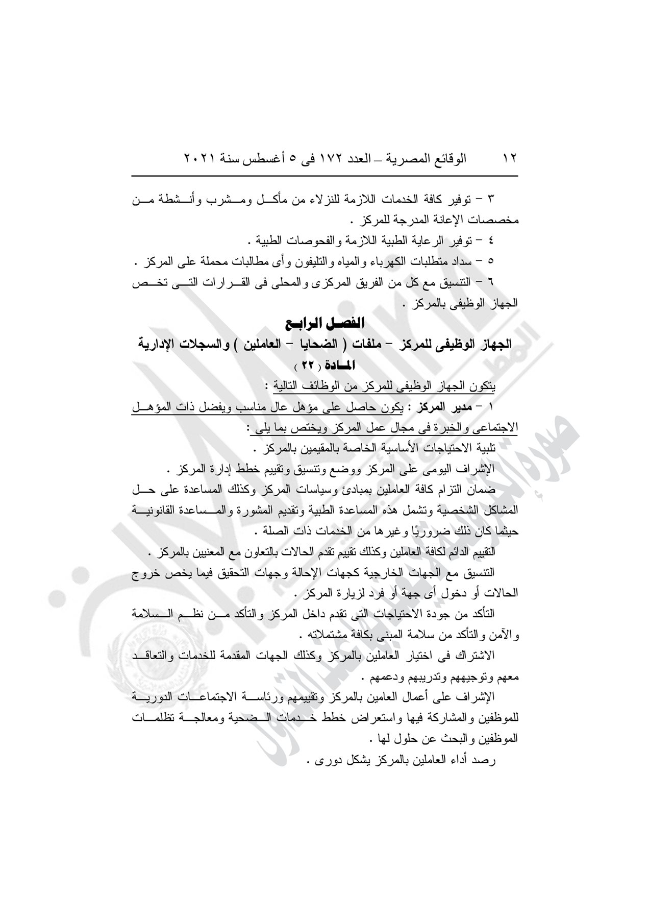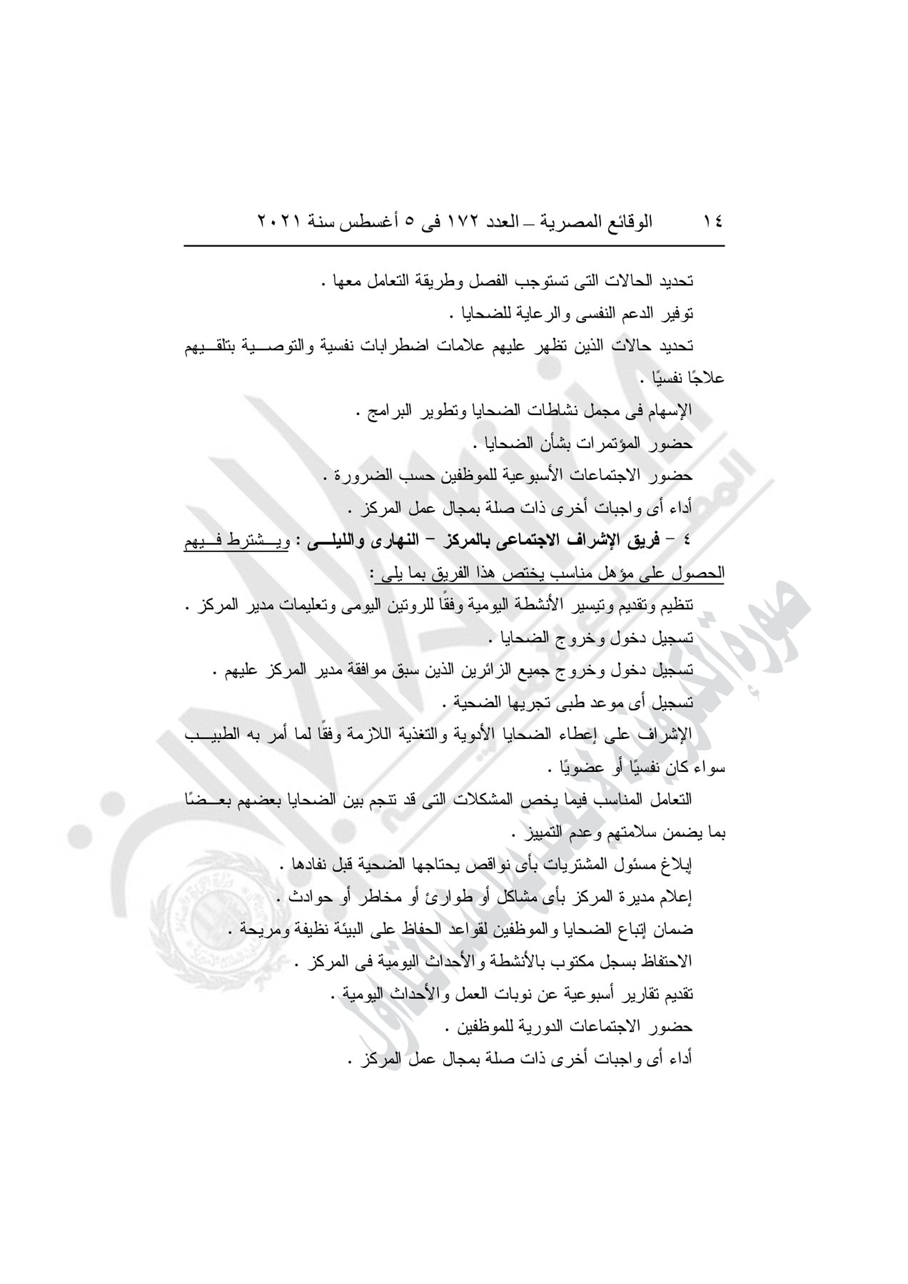 نشرت جريدة الوقائع المصرية في عددها رقم 172، الصادر في 5 أغسطس 2021، قرار وزارة التضامن الاجتماعي رقم 289 لسنة 2021، بشأن العمل باللائحة النموذجية المنظمة للعمل بمراكز ضحايا الإتجار بالبشر.