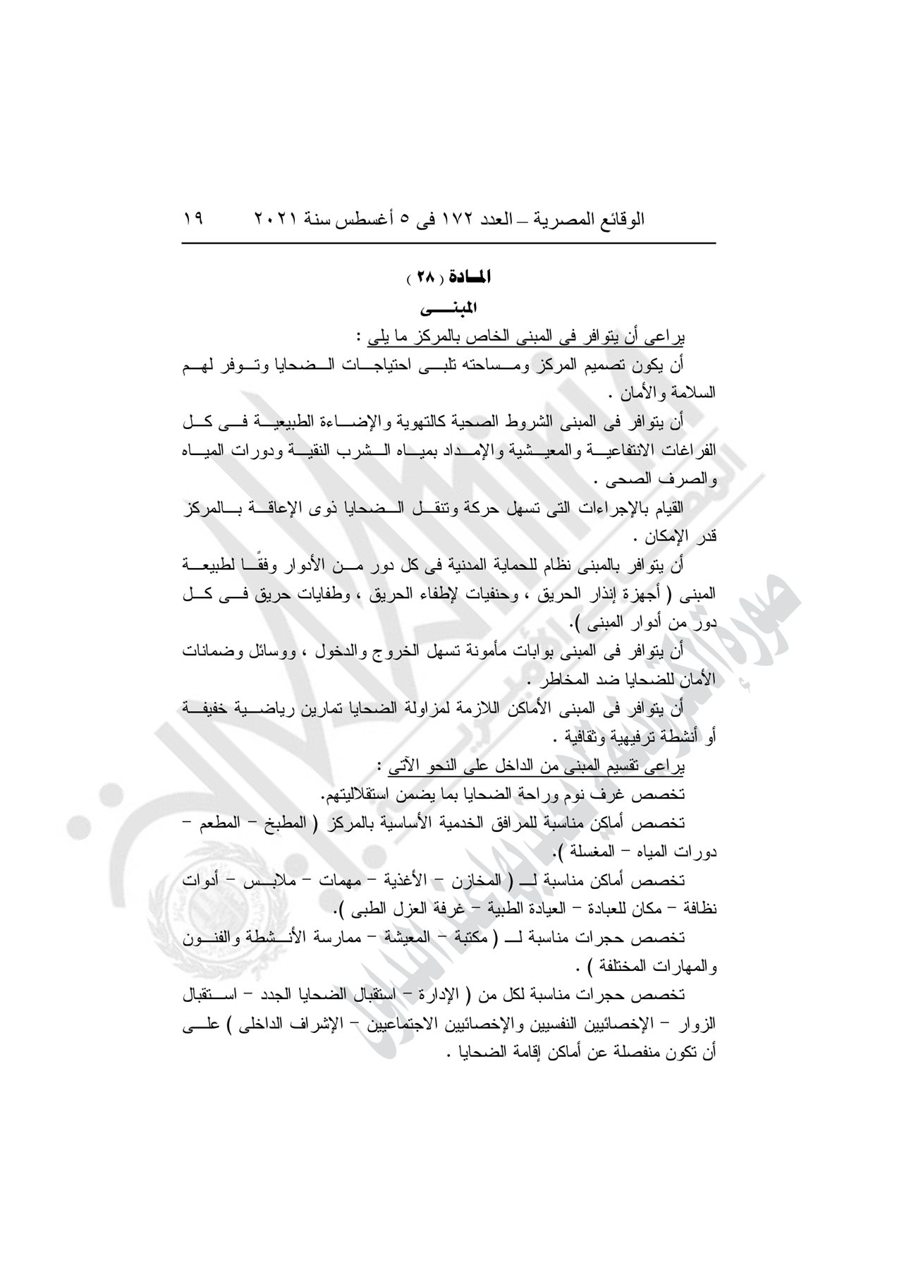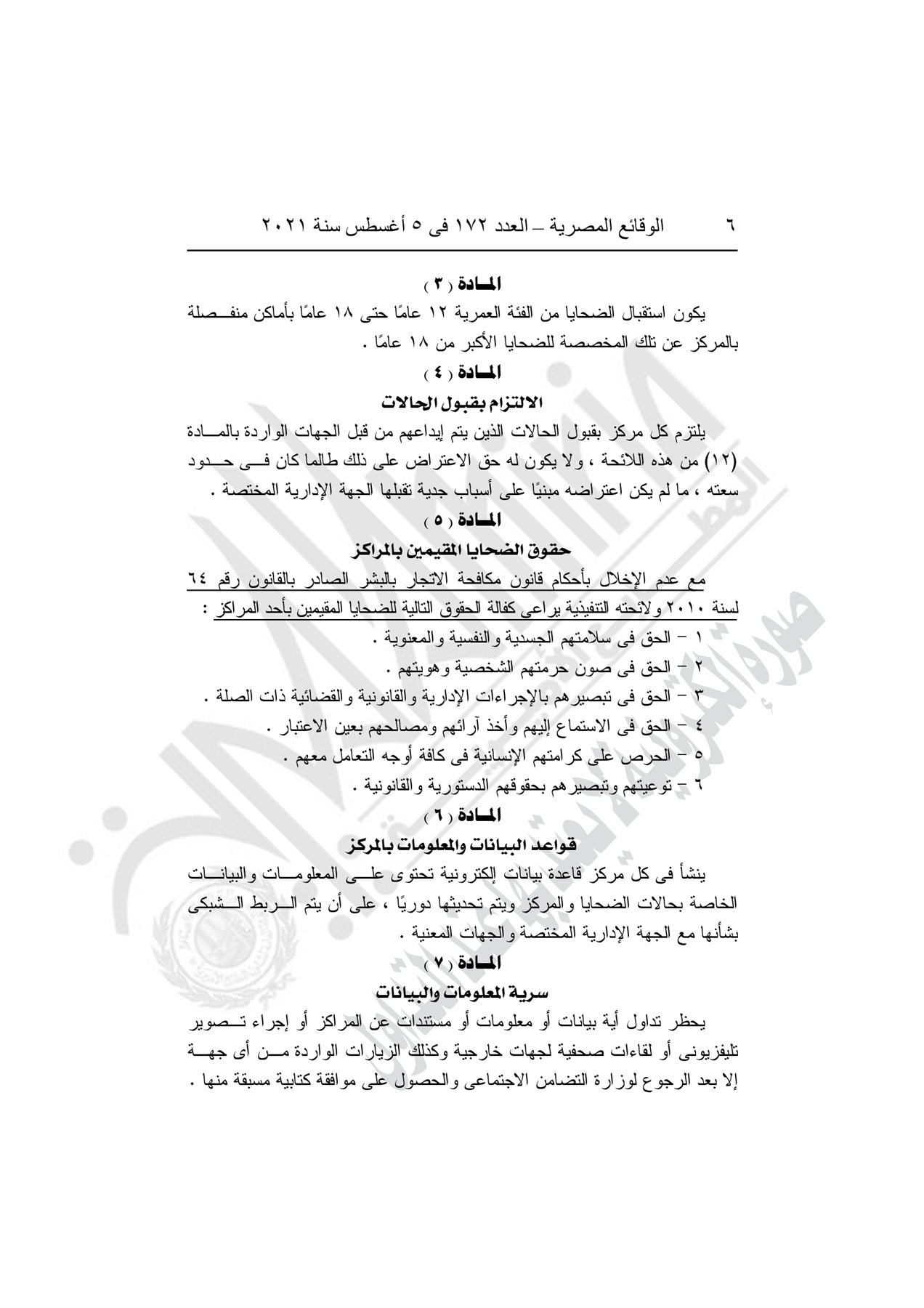 وجاء في نص المادة الثانية "يلتزم مركز إيواء الفتيات والنساء ضحايا الإتجار بالبشر القادم حاليًا، والكائن مقره بقرية نامول بمركز قها بمحافظة القليوبية بتوفيق أوضاعها خلال سنة من تاريخ العمل باللائحة المرافقة للقرار.