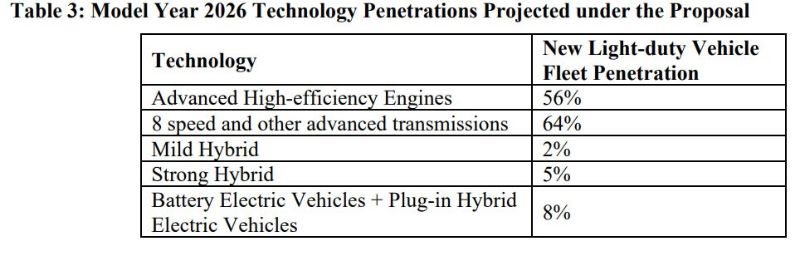 وفي حين أن البيت الأبيض روج لهذه الخطوة والتي من شأنها تعزيز شعبية السيارات ذات الانبعاثات الصفرية، فإن ذلك لن يحدث على الفور، حيث تتوقع وكالة حماية البيئة أن السيارات الكهربائية ستحصل على حصة سوقية بنسبة 8% فقط بحلول 2026، وبدلًا من ذلك، تعتقد الحكومة أن معظم مكاسب تقليل استهلاك الوقود ستتحقق من خلال محركات متقدمة عالية الكفاءة، ونواقل الحركة ذات الـ 8 سرعات ونواقل حركة أخرى.
