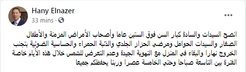 وكتب هاني الناظر تدوينة على الفيس بوك "انصح السيدات والسادة كبار السن فوق الستين عاما وأصحاب الأمراض المزمنة والأطفال الصغار والسيدات الحوامل ومرضي الحزاز الجلدي والذئبة الحمراء والحساسية الضوئية بتجنب الخروج نهارا والبقاء في المنزل مع التهوية الجيدة وعدم التعرض للشمس خلال هذه الأيام خاصة الفترة بين التاسعة صباحا وحتي الخامسة عصرا وربنا يحفظكم جميعا".