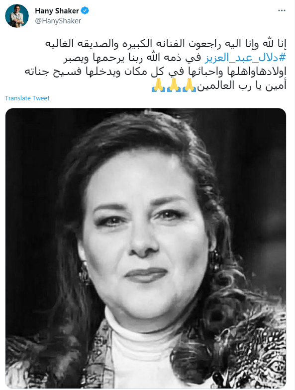وكتب هاني شاكر تغريدة على تويتر "إنا لله وإنا إليه راجعون الفنانة الكبيرة والصديقة الغالية #دلال_عبد_العزيز في ذمه الله ربنا يرحمها ويصبر أولادها وأهلها وأحبائها في كل مكان ويدخلها فسيح جناته آمين يا رب العالمين".