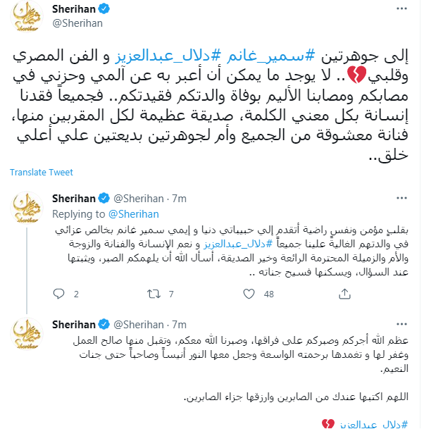 وكتبت شريهان تغريدة على تويتر "إلى جوهرتين #سمير_غانم #دلال_عبدالعزيز والفن المصري وقلبي.. لا يوجد ما يمكن أن أعبر به عن آلمي وحزني في مصابكم ومصابنا الأليم بوفاة والدتكم فقيدتكم.. فجميعًا فقدنا إنسانة بكل معني الكلمة، صديقة عظيمة لكل المقربين منها، فنانة معشوقة من الجميع وأم لجوهرتين بديعتين علي أعلي خلق.."