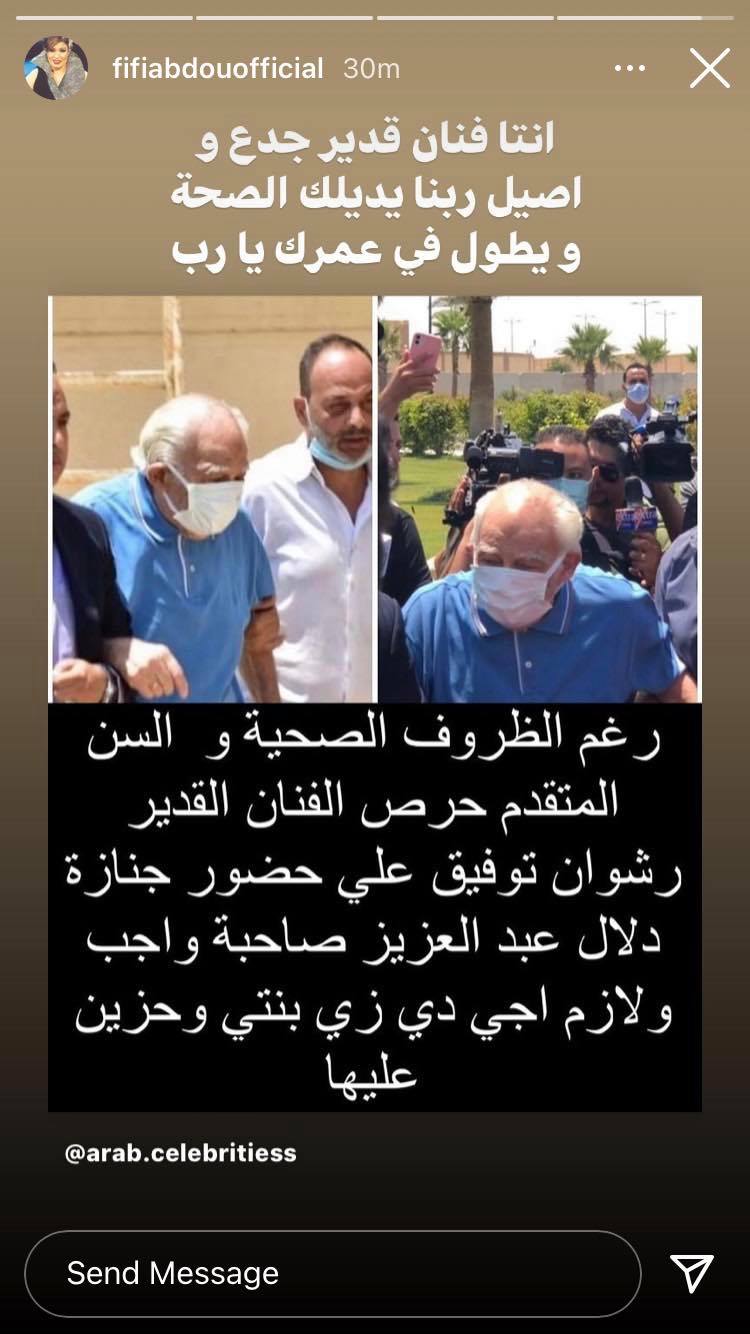 ونشرت "فيفي" صورة رشوان توفيق من خلال خاصية "ستوري" عبر حسابها الشخصي على موقع تبادل الصور والفيديوهات "إنستجرام" معلقة قائلة:"أنت فنان قدير وجدع أصيل ربنا يديلك الصحة ويطول في عمرك يا رب".