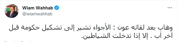 وكتب وئام وهاب تغريدة على تويتر بعد لقائه بميشال عون فقال: "الأجواء تشير إلى تشكيل حكومة قبل آخر آب، إلا إذا تدخلت الشياطين".
