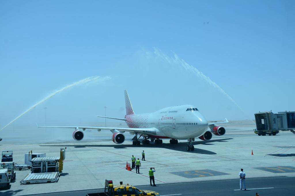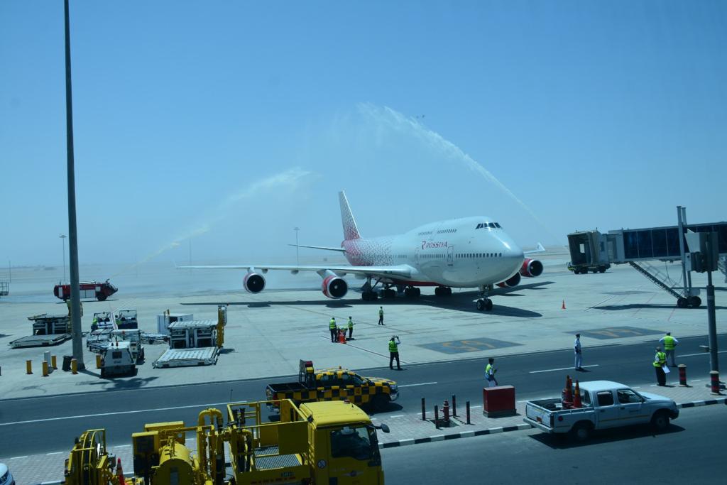 وقالت شركة مصر للطيران، أنه تم استقبال الطائرة بتقليد رش المياه المتعارف عليه فور هبوط الرحلات الجديدة إلى أرض المطار، كما تم استقبال الركاب بالورود وتوزيع هدايا تذكارية عليهم بهذه المناسبة.