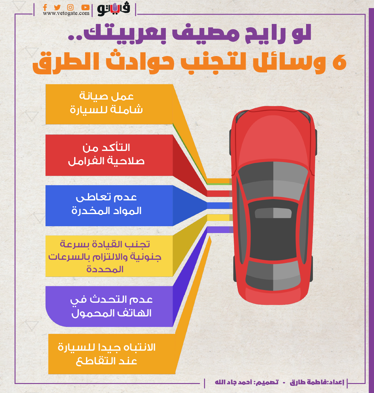 لو رايح مصيف بعربيتك.. ٦ وسائل لتجنب حوادث الطرق| انفوجراف الجمعة 13/أغسطس/2021 - 02:30 م 8/13/2021 2:30:23 PM فاطمة طارق شارك طباعة 18 حجم الخط شارك طباعة وزارة الداخلية الادارة العامة للمرور الحركة المرورية ضباط المرور المرور أجهزة وزارة الداخلية ادارات المرور تجاوز السرعة المقررة وقوع الحوادث لادارة العامة للمرور الحوادث علي الطرق القيادة بسرعة جنونية