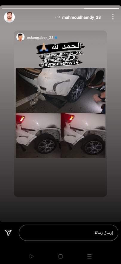 ونشر محمود حمدي الونش صورة على حسابه الرسمي على موقع الصور الشهير "إنستجرام" توضح تعرضه إلى حادث سير برفقة "أيمن حفني وإسلام جابر وأشرف روقا" لاعبي نادي الزمالك، بعدما انفجر أحد إطارات السيارة التي كانوا يستقلونها عند عودتهم من الإسكندرية منذ قليل.