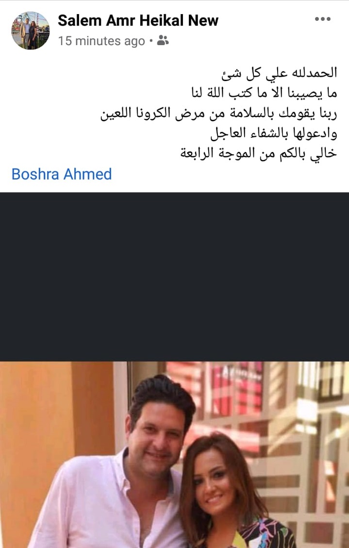 وقال سالم، في منشور عبر حسابه على موقع التواصل الاجتماعي "فيس بوك": "الحمد لله على كل شيء.. ما يصيبنا إلا ما كتبه الله لنا.. ربنا يقومك بالسلامة من مرض كورونا اللعين.. وادعوا لها بالشفاء العاجل.. خلى بالكم من الموجة الرابعة".