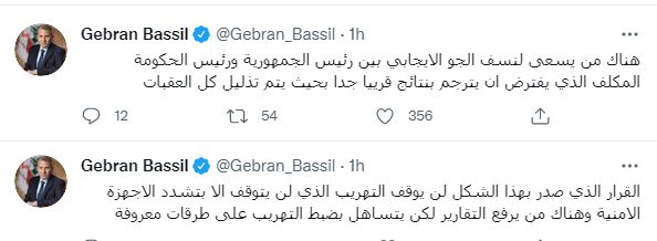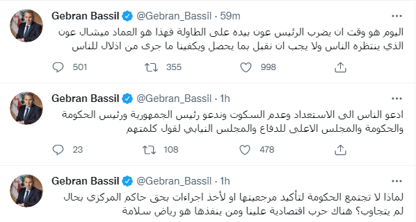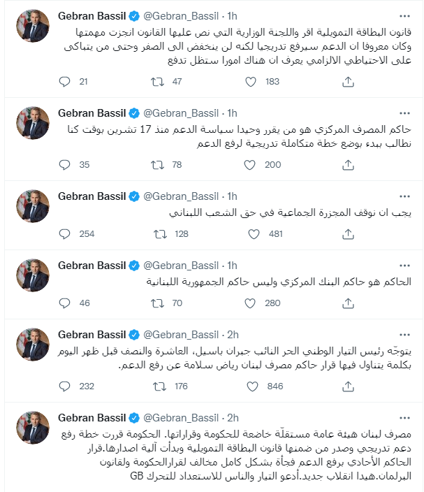 وكتب جبران باسيل تغريدة على تويتر "مصرف لبنان هيئة عامة مستقلّة خاضعة للحكومة وقراراتها. الحكومة قررت خطة رفع دعم تدريجي وصدر من ضمنها قانون البطاقة التمويلية وبدأت آلية اصدارها.قرار الحاكم الأحادي برفع الدعم فجأة بشكل كامل مخالف لقرار الحكومة ولقانون البرلمان.هيدا انقلاب جديد.أدعو التيار والناس للاستعداد للتحرك"