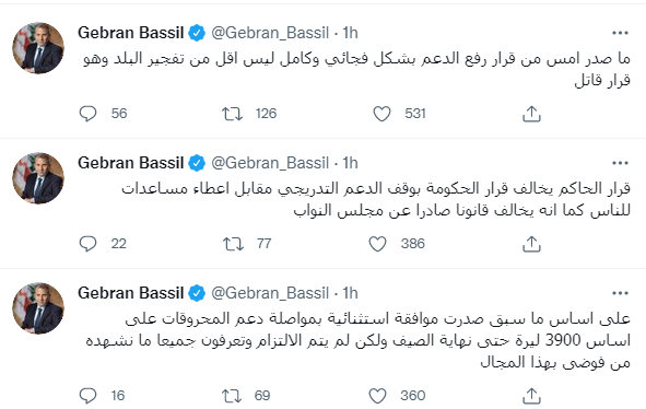 وعلق جبران باسيل قائلًا: "ما صدر امس من قرار رفع الدعم بشكل فجائي وكامل ليس اقل من تفجير البلد وهو قرار قاتل"