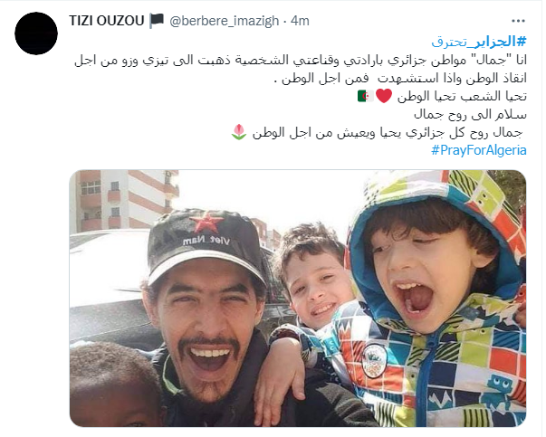 وأضاف محمد:"تطوع ليقدم لهم المساعدة وحرق فقط لأنه عربي ليس من عرقهم. نثق في عدالة الحكومة الجزائرية وقيادتها في حماية الحقوق وإقامة العدل، وتقديم كل المجرمين للعدالة بأسرع وقت منعا للفتنه.. #حرق_شاب_في_تيزي_وزو #جمال_بن_سماعيل #تيزي_وزو".