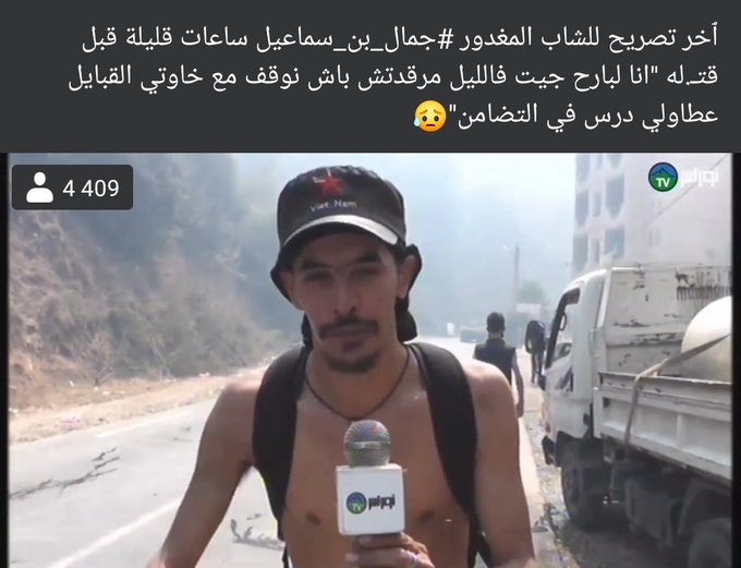 تفاعل نشطاء مواقع التواصل الاجتماعي مع قصة جمال فقالت آمال زروق "الرجل الذي قُتل حرقا وهو حيا يرزق بتهمة #حرق_الغابات يُدعى #جمال_بن_سماعيل المدعو #جيمي ينحدر من مدينة #مليانة بـ #عين_الدفلى "فنان موسيقي ورسام"، أخبر أهله قبل #مغادرته أنّه ذاهب لتقديم يد #العون بولاية #تيزي_وزو"