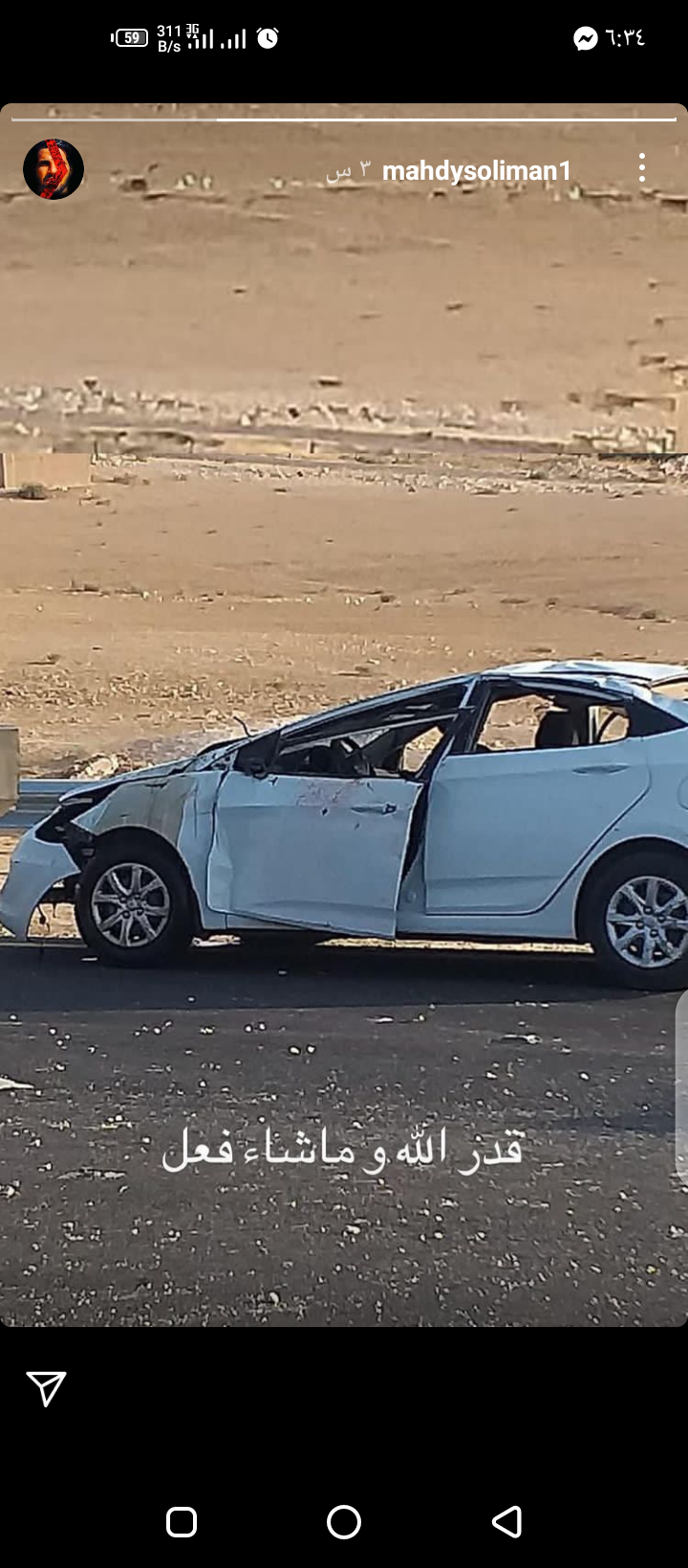 نشر حارس مرمي نادي بيراميدز المهدي سليمان صورة لسيارته علي ستوري موقع الصور انستجرام وهي مهشمه نتيجة لحادث معلقا قدر الله وماشاء فعل".