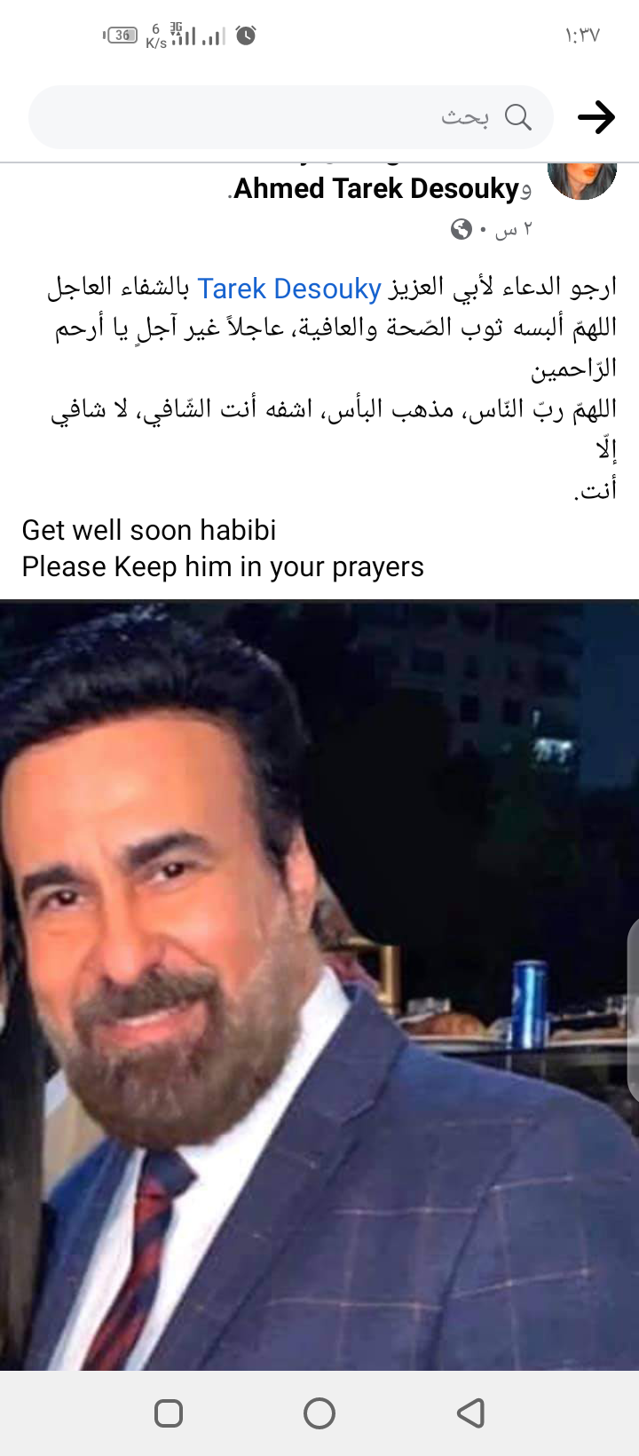 وقالت ابنة الفنان: "أرجو الدعاء لأبي العزيز Tarek Desouky بالشفاء العاجل