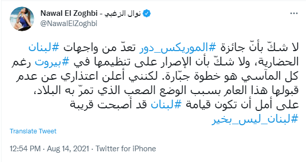 وكتبت نوال الزغبي قائلة: "لا شكّ بأنّ جائزة الموريكس دور، تعد من واجهات لبنان الحضارية، ولا شك بأن الإصرار على تنظيمها في بيروت رغم كل المآسي هو خطوة جبارة".