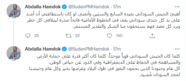وكتب عبد الله حمدوك تغريدة على تويتر "أهنئ الجيش السوداني بعيده السابع والستين وأتمنى لو كان باستطاعتي أن أشد على يد كل جندي سوداني يقف في الخطوط الأمامية فاتحًا صدره ليتلافى كل خطر ويرد كل معتد فهم يستحقون منا الشكر والتقدير المستمر"