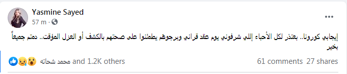 وكتبت ياسمين الخطيب قائلة: "إيجابي كورونا.. بعتذر لكل الأحباء اللي شرفوني يوم عقد قراني وبرجوهم يطمنوا على صحتهم بالكشف أو العزل المؤقت.. دمتم جميعًا بخير".