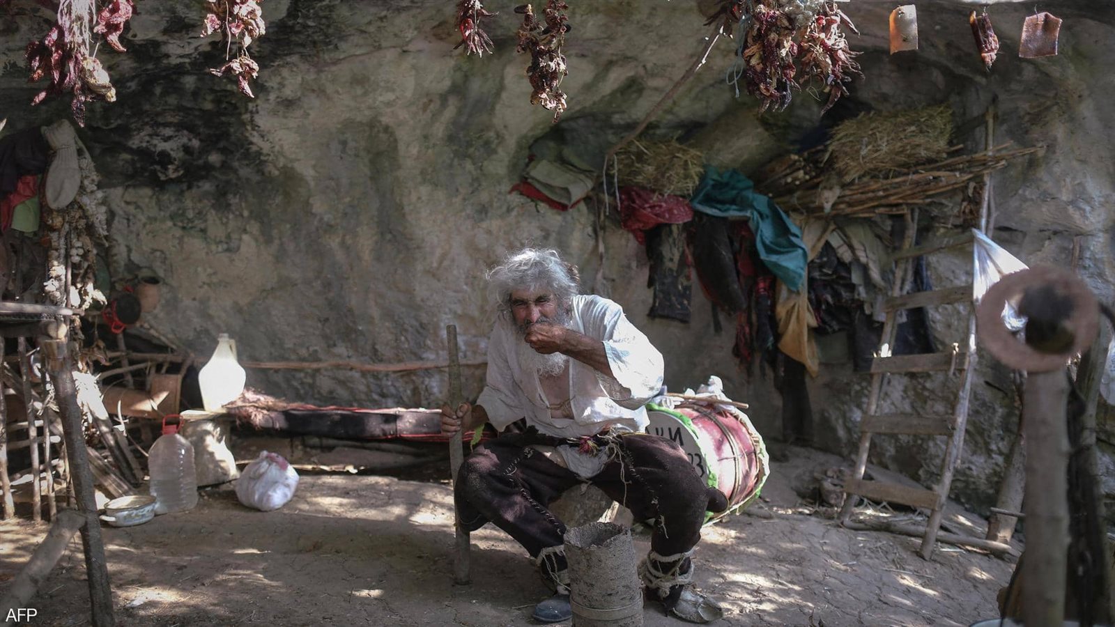وداخل الكهف، يعيش الرجل المسن مع حيوانات مثل الماعز والدجاج والقطط، بالإضافة إلى كلب.