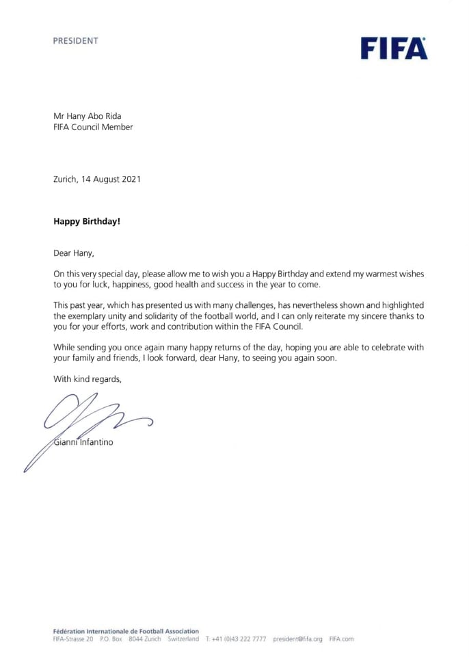 وأرسل إنفانتينو خطاب تهنئة لأبو ريدة، ذكر فيه: "في هذا اليوم الخاص أتمنى لك عيد ميلاد سعيد، وأشكرك على جهودك الكبيرة في مجلس فيفا، التي ساعدتنا على تخطي الأوقات العصيبة بالمرحلة الماضية التي شهدت أوقاتا عصيبة".