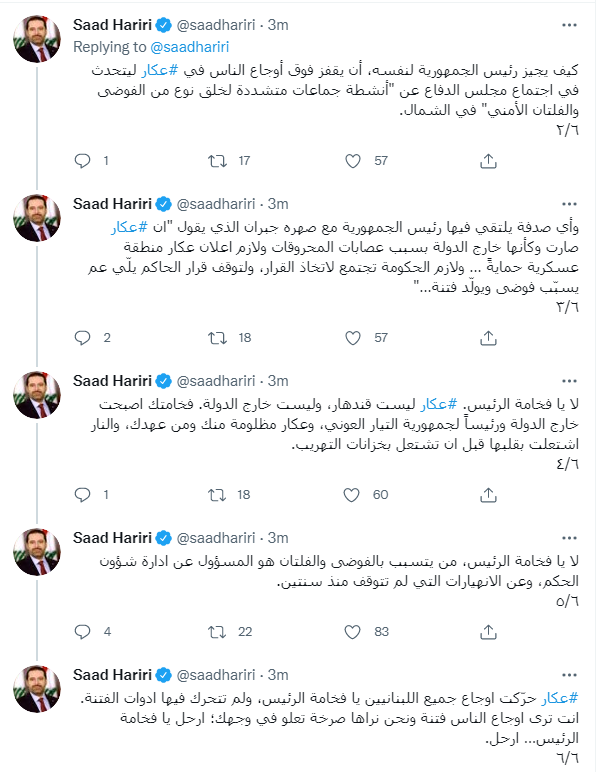 وعلق سعد الحريري قائلًا: "لا يا فخامة الرئيس. #عكار ليست قندهار، وليست خارج الدولة. فخامتك أصبحت خارج الدولة ورئيسًا لجمهورية التيار العوني، وعكار مظلومة منك ومن عهدك، والنار اشتعلت بقلبها قبل ان تشتعل بخزانات التهريب".