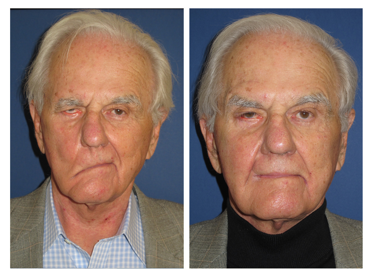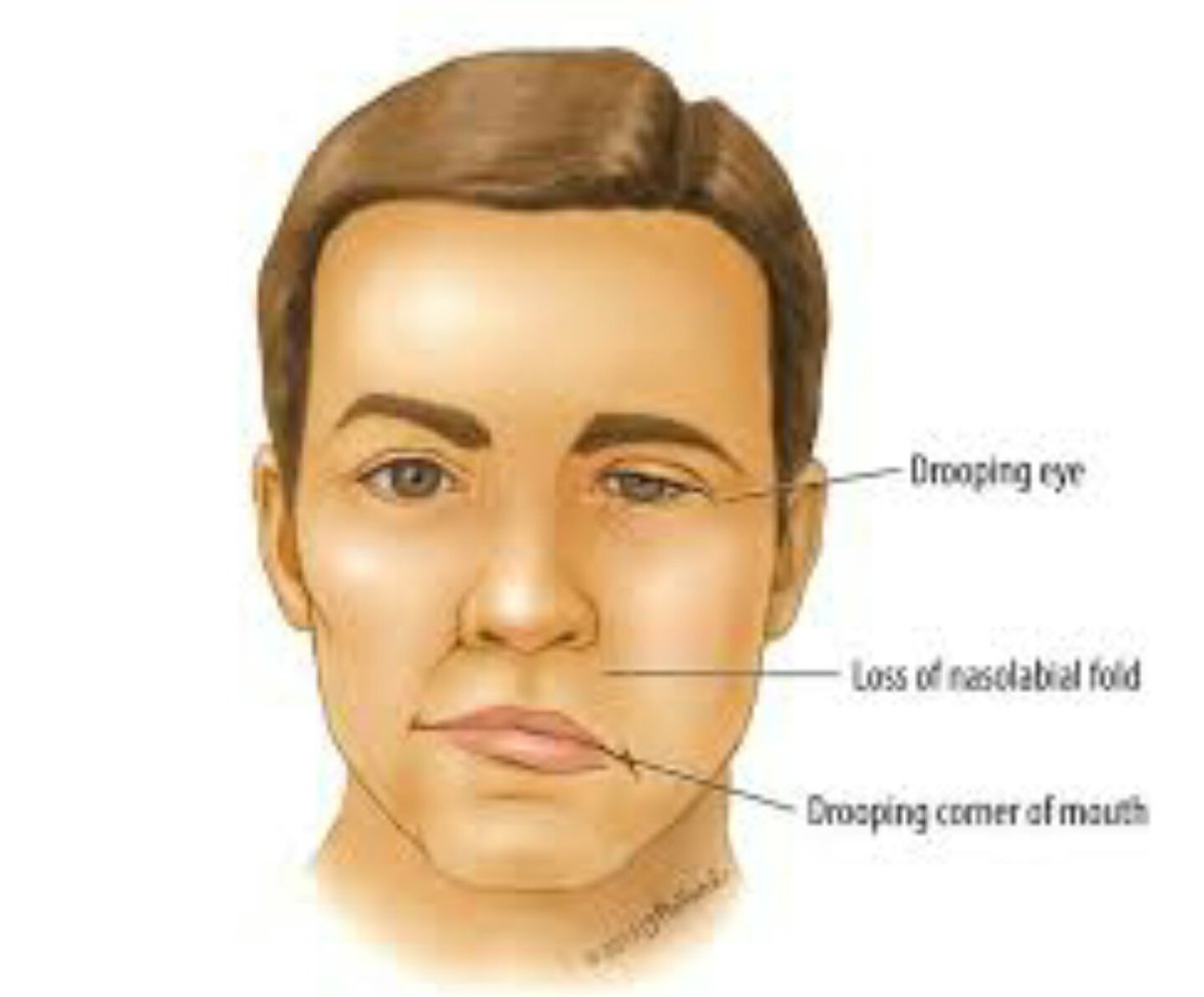 ولا يستطيع المريض غلق عينيه مع جفاف الدموع فيها، مع اعوجاج ملحوظ للفم مما ينتج عنه الصعوبة في النطق.