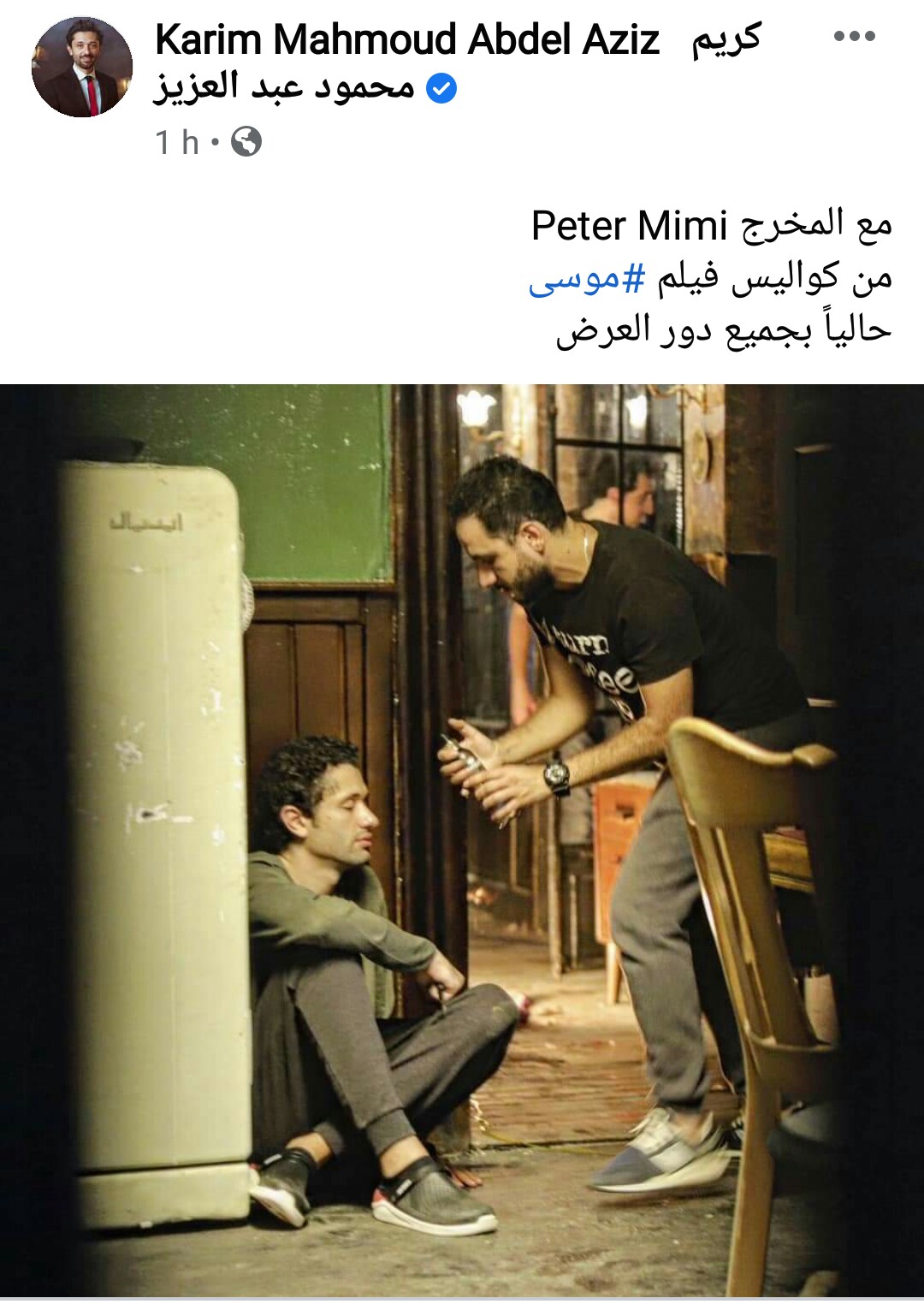 نشر الفنان كريم محمود عبد العزيز عبر حسابه الشخصي على موقع التواصل الاجتماعي "فيس بوك" صورة من كواليس فيلم موسى تجمعه بمخرج الفيلم بيتر ميمي، والذي يعرض حاليا بالسينمات.