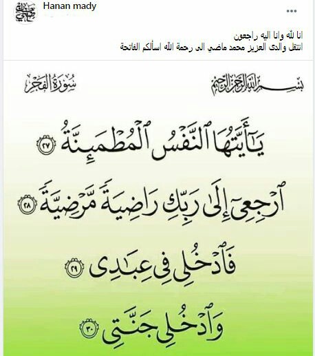 وكتبت حنان ماضي قائلة: "إنا لله وإنا إليه راجعون انتقل والدى العزيز محمد ماضي إلى رحمة الله أسألكم الفاتحة".