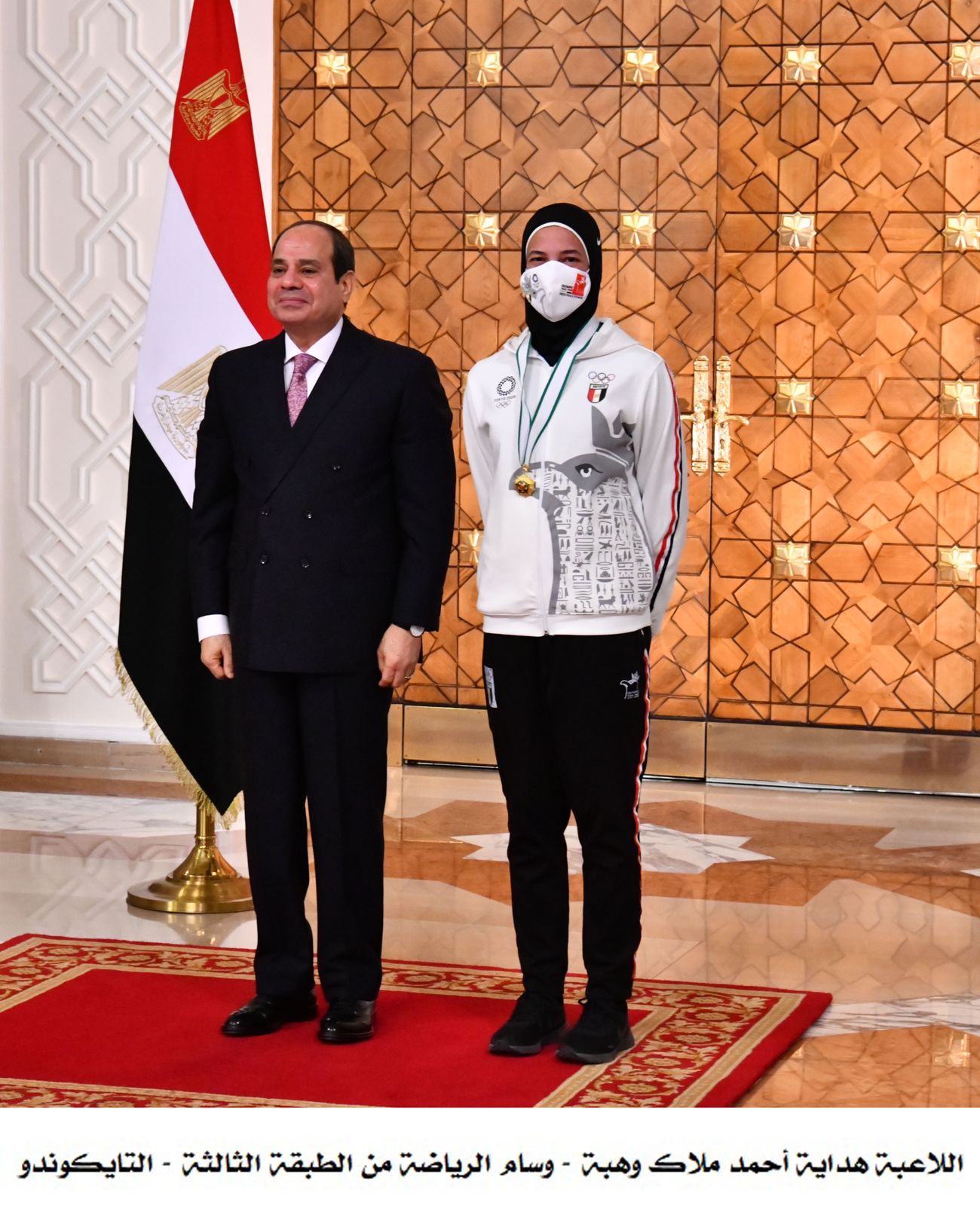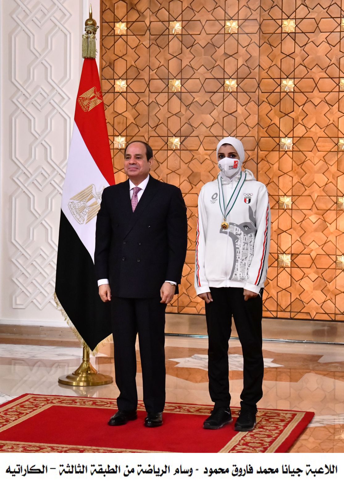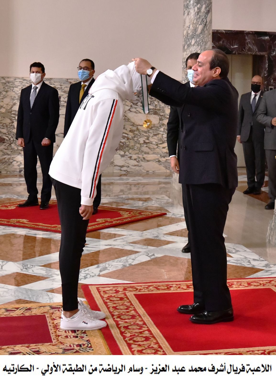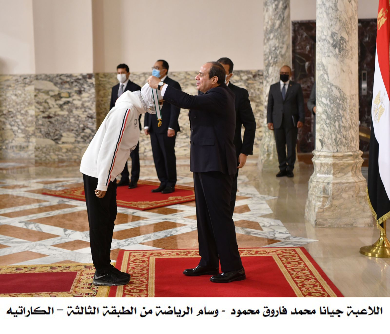 استقبل الرئيس عبد الفتاح السيسي اليوم اللاعبين واللاعبات والأطقم التدريبية المتوجة بميداليات خلال دورة الألعاب الأولمبية الأخيرة في طوكيو 2020، حيث قام الرئيس بمنح وسام الرياضة من الطبقة الأولى للاعبة الكاراتيه فريال عبد العزيز ومدربها هاني قشطة، ووسام الرياضة من الطبقة الثانية للاعب الخماسي الحديث أحمد الجندي ومدربه عبد الرحمن محمد، ووسام الرياضة من الطبقة الثالثة لكلٍ من لاعبة الكاراتيه جيانا فاروق ومدربها محمد عبد الرجال، ولاعب المصارعة محمد إبراهيم ومدربه محمد أحمد، ولاعبَي التايكوندو هداية ملاك وسيف عيسى ومدربَيهما أسامة سيد ومحمد مجدي والمدير الفني أوسكار سالازار.