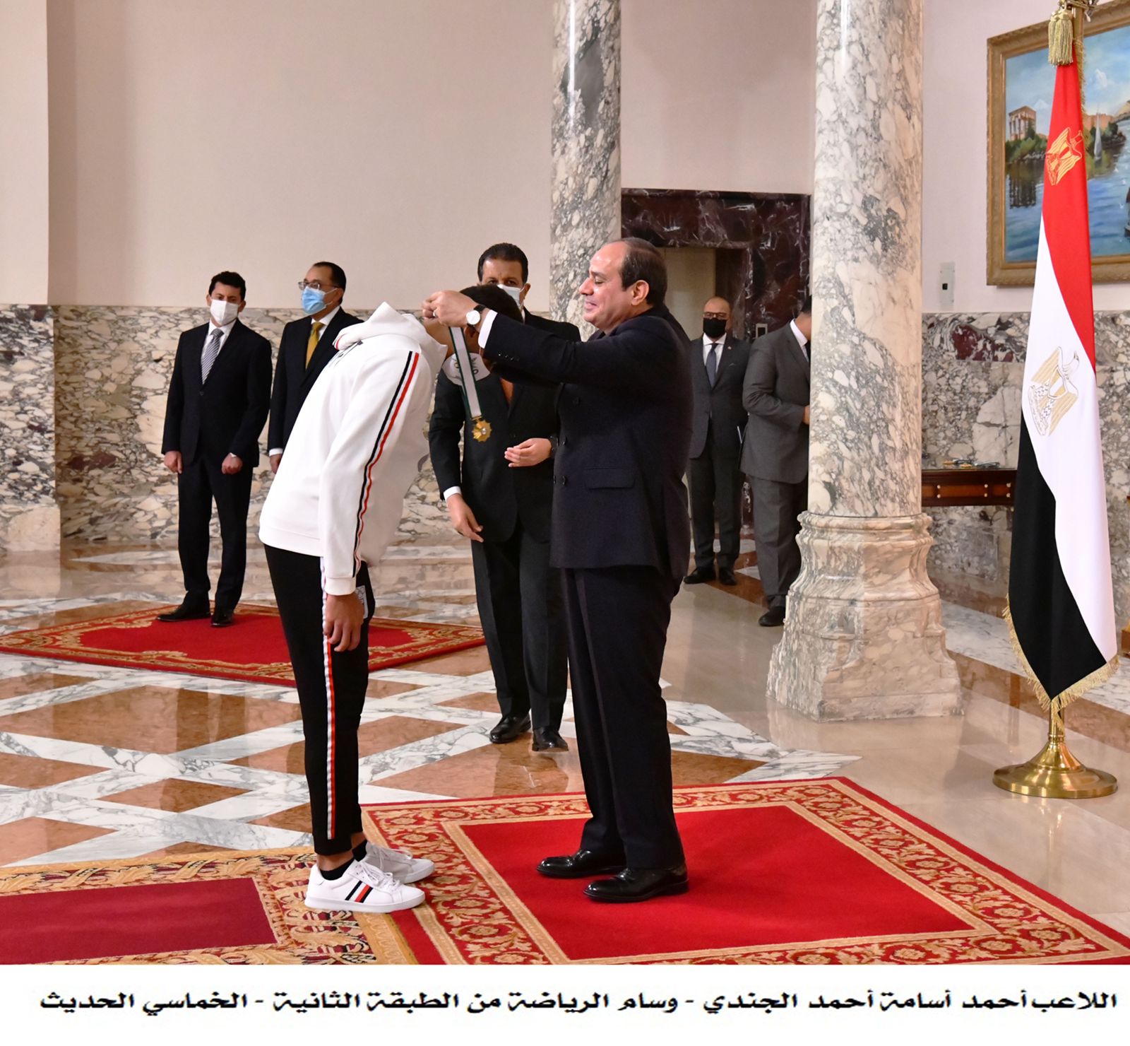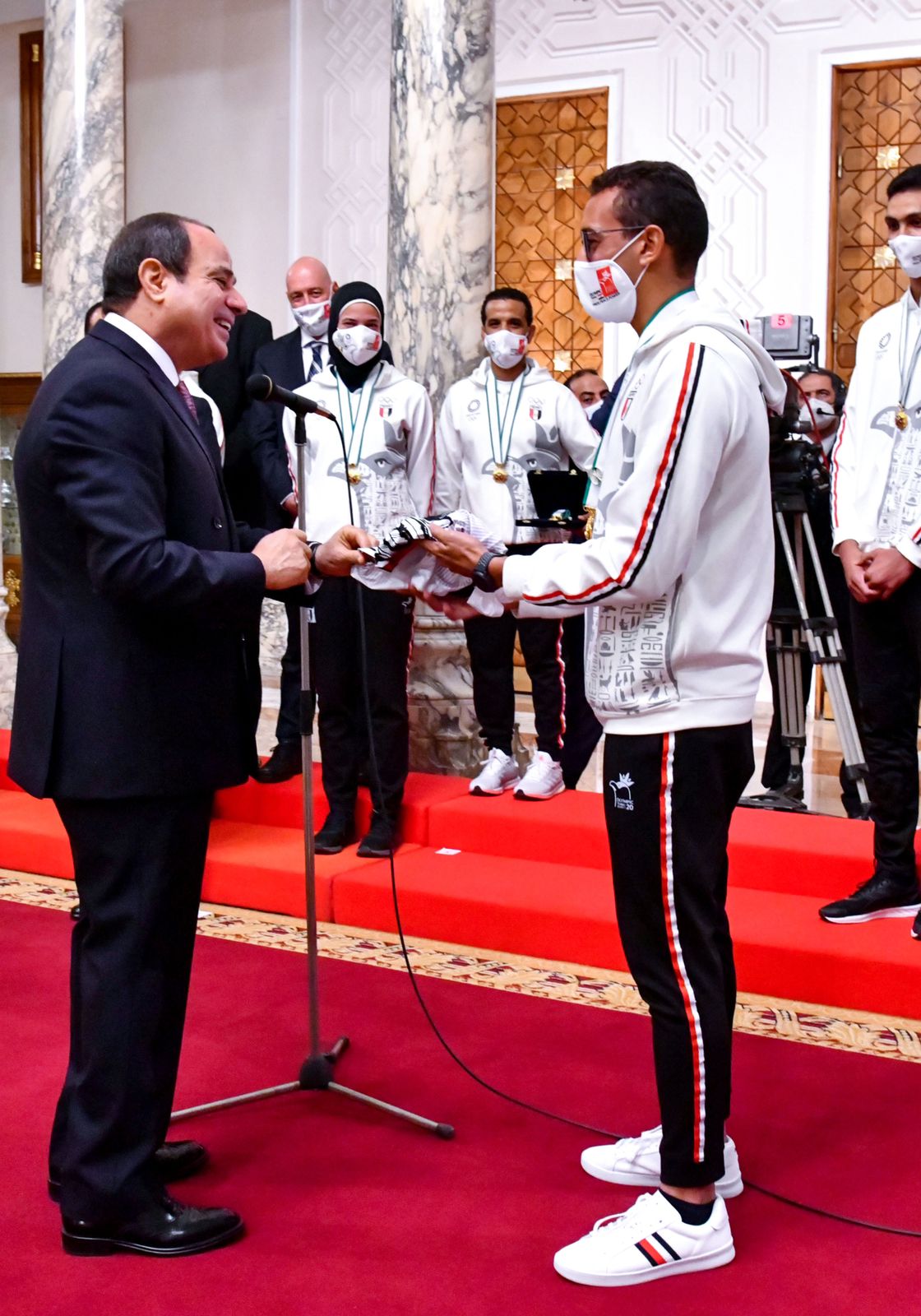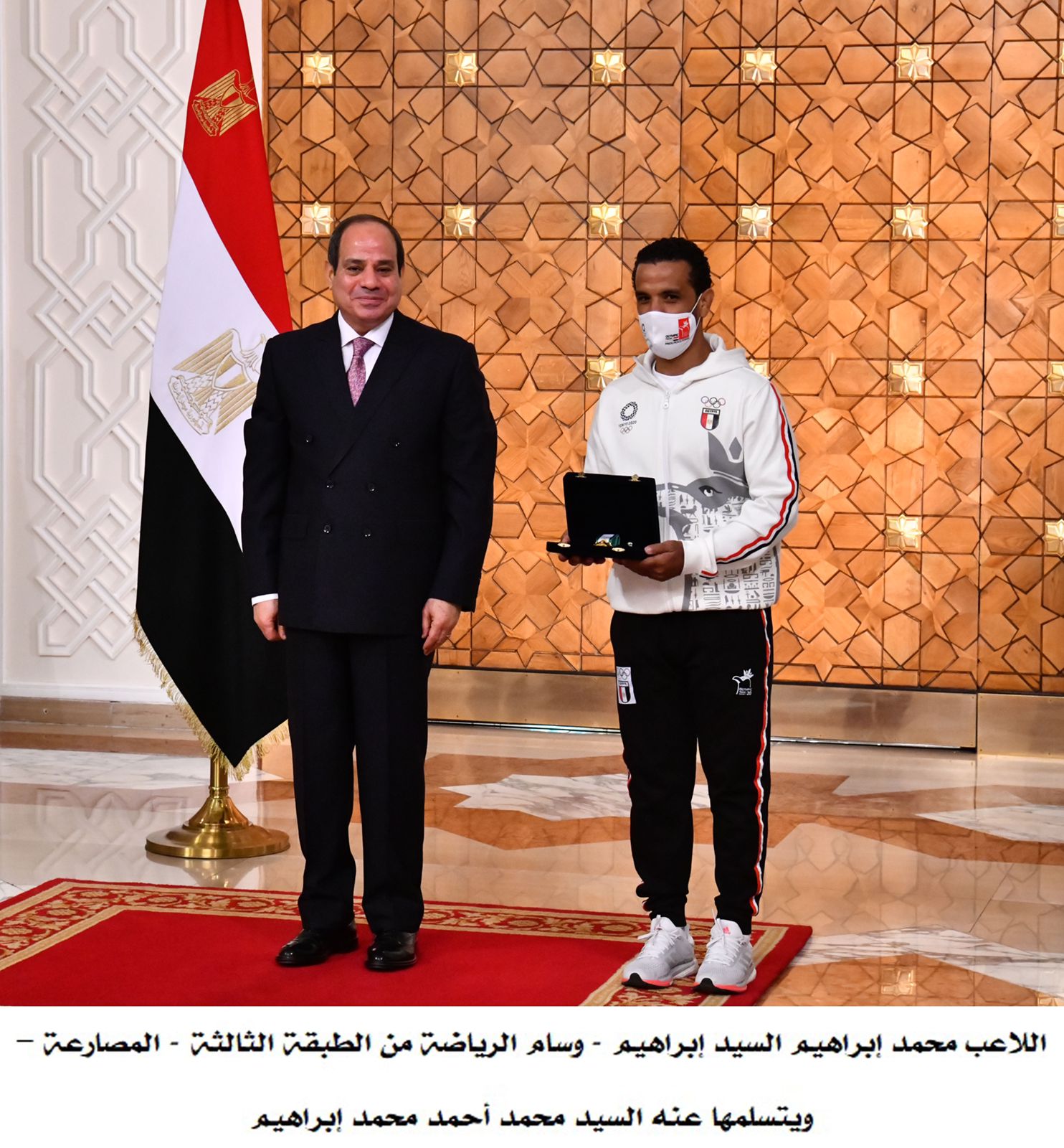استقبل الرئيس عبد الفتاح السيسي اليوم اللاعبين واللاعبات والأطقم التدريبية المتوجة بميداليات خلال دورة الألعاب الأولمبية الأخيرة في طوكيو 2020، حيث قام الرئيس بمنح وسام الرياضة من الطبقة الأولى للاعبة الكاراتيه فريال عبد العزيز ومدربها هاني قشطة، ووسام الرياضة من الطبقة الثانية للاعب الخماسي الحديث أحمد الجندي ومدربه عبد الرحمن محمد، ووسام الرياضة من الطبقة الثالثة لكلٍ من لاعبة الكاراتيه جيانا فاروق ومدربها محمد عبد الرجال، ولاعب المصارعة محمد إبراهيم ومدربه محمد أحمد، ولاعبَي التايكوندو هداية ملاك وسيف عيسى ومدربَيهما أسامة سيد ومحمد مجدي والمدير الفني أوسكار سالازار.